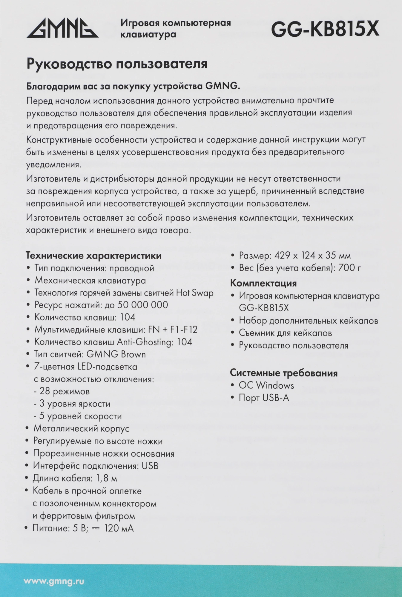 | Размеры клавиатуры | 429x35x124мм |