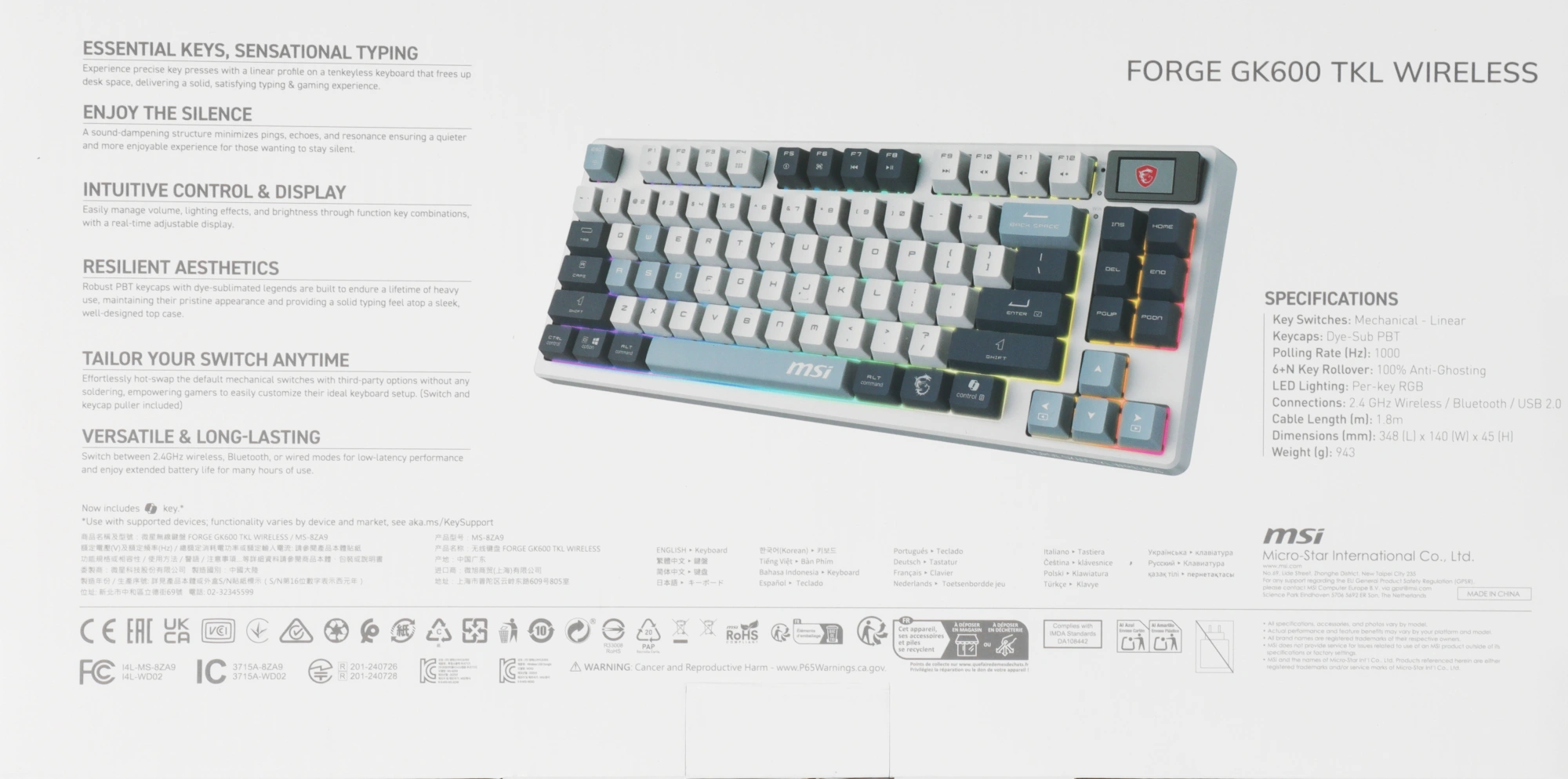 Клавиатура MSI Forge GK600 механическая белый/синий USB беспроводная BT/Radio Multimedia for gamer LED (S11-43RUP01-HH9) кабель 1.8м