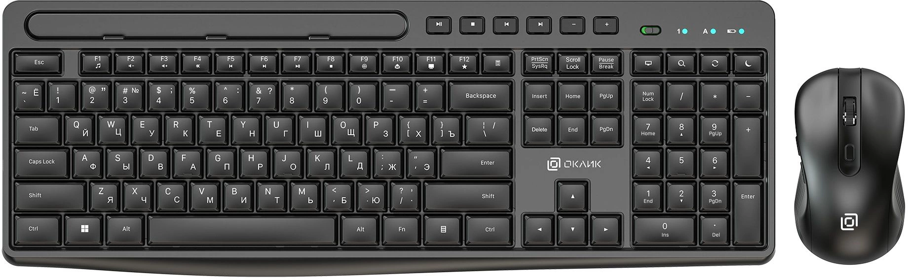 | Особенности комплекта | Бесшумный офисный комплект с дополнительными клавишами клавиатуры и беспроводным подключением. Размер холдера для размещения мобильных устройств: 21,5 см x 1,5 см. |