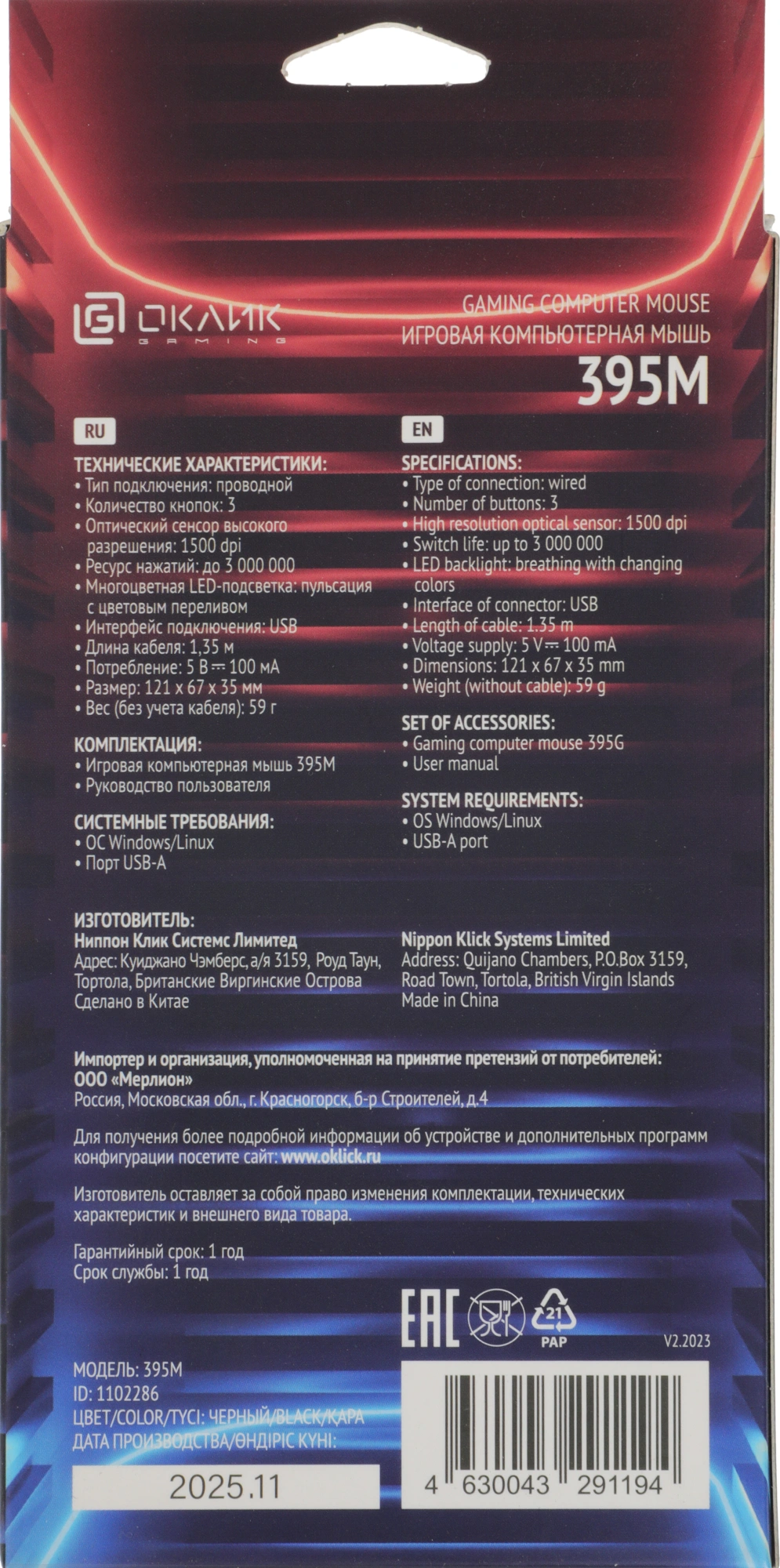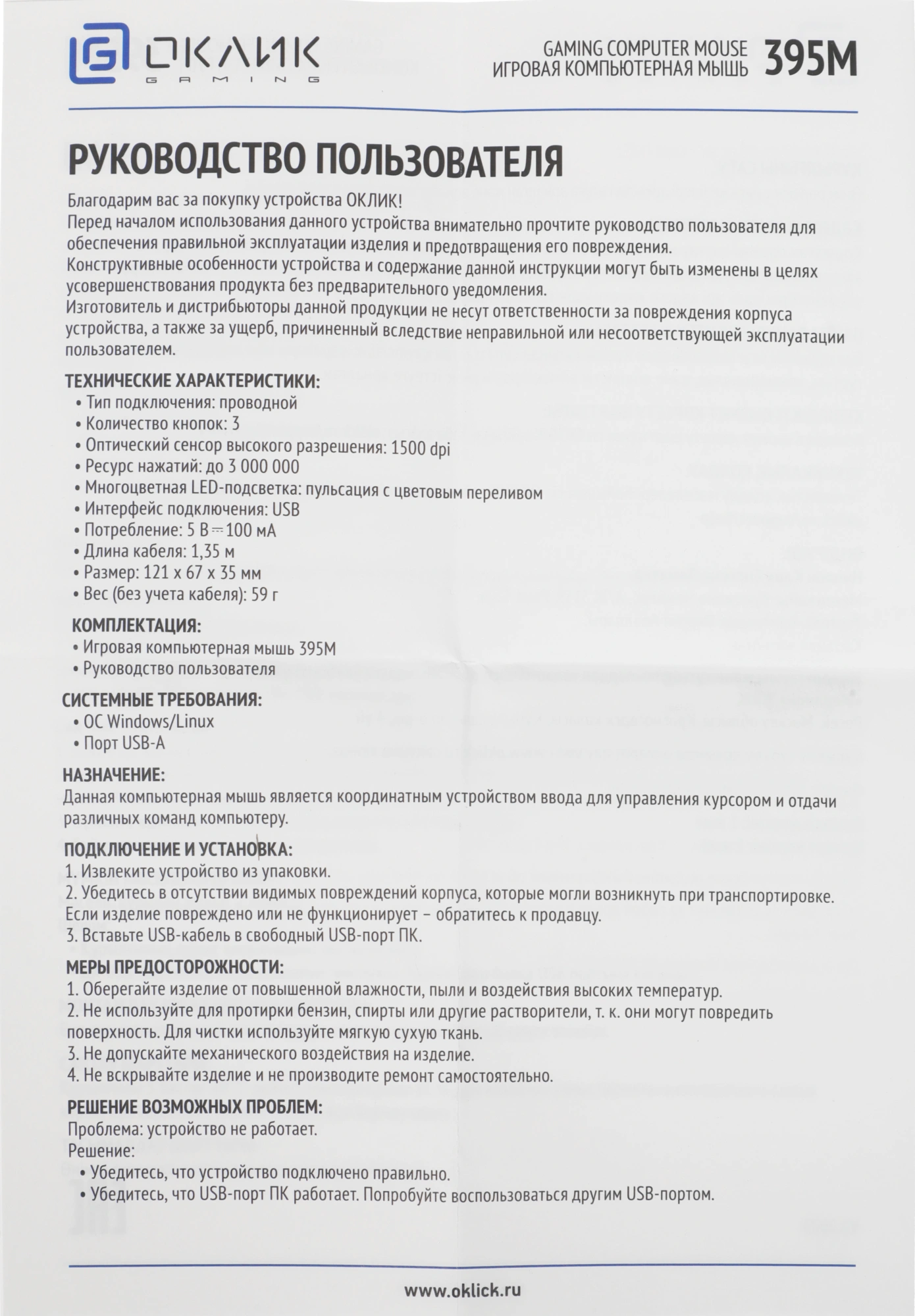 | Комплектация | Игровая компьютерная мышь 395M |