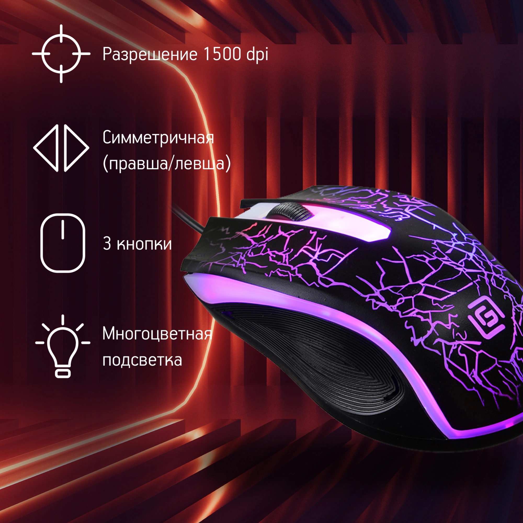 | Особенности | Симметричная компьютерная мышь. удобная офрма. Многоцветная подсветка (пульсация с цветовым переливом). Специальное ПО расширяющее функциональные возможности мышки. |