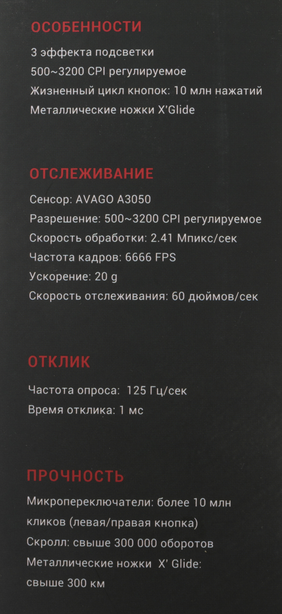 | Особенности | Сенсор: AVAGO A3050 Gaming Engine. Дополнительная изящная подсветка |