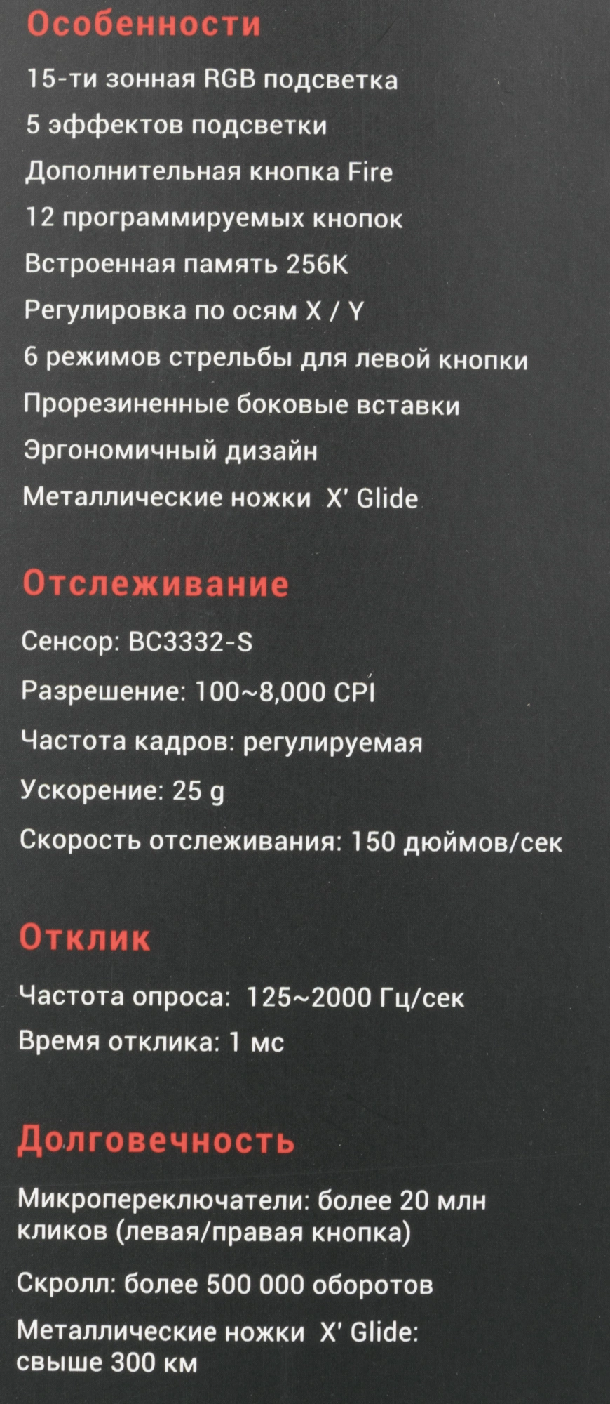 | Особенности | 15-ти зонная RGB подсветка 5 эффектов подсветки Дополнительная кнопка Fire 12 программируемых кнопок Встроенная память 256K Регулировка по осям X / Y 6 режимов стрельбы для левой кнопки Прорезиненные боковые вставки Эргономичный дизайн Металлические ножки X' Glide |