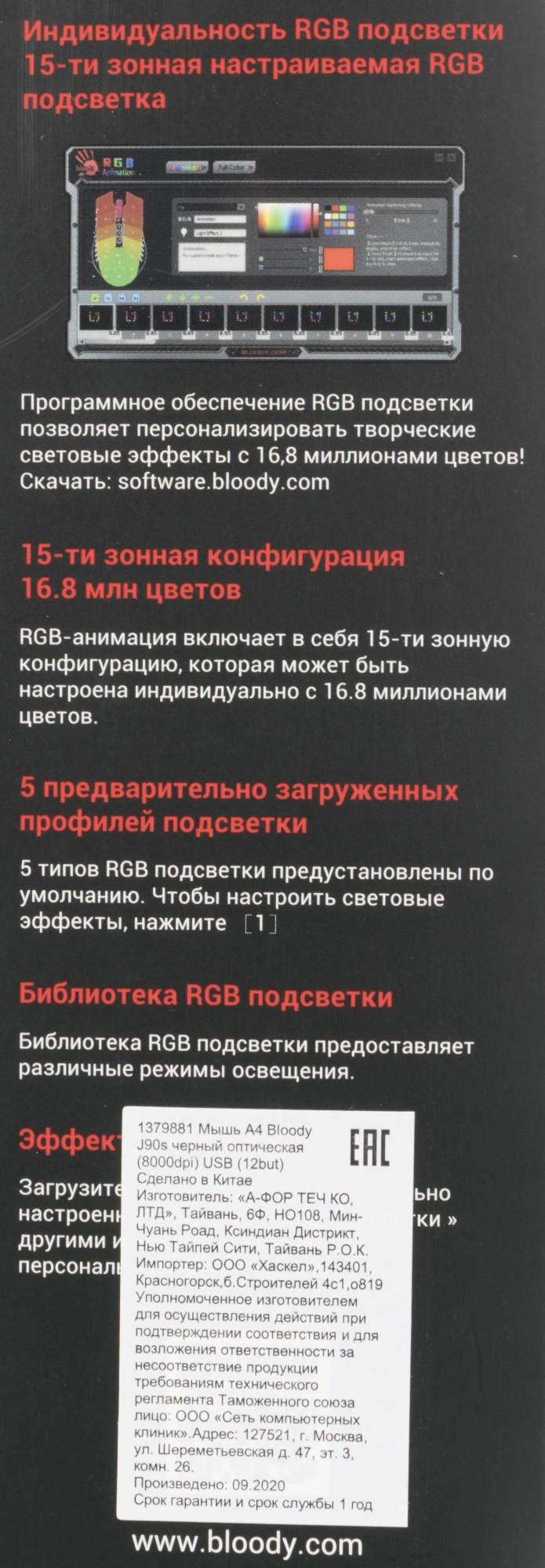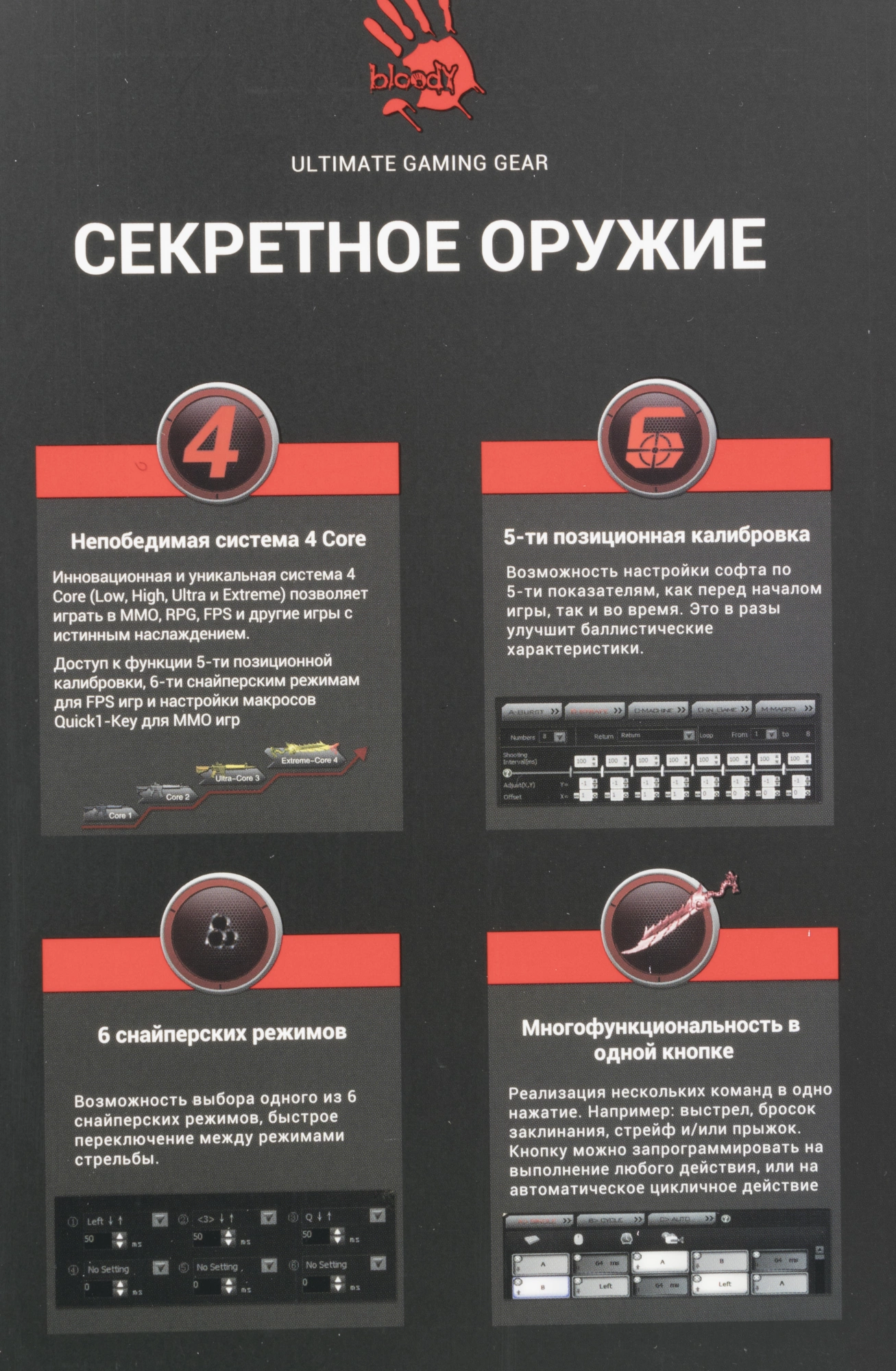 | Особенности | При установке ПО Bloody7, уровни core3,4 активированы бесплатно. 15-ти зонная RGB подсветка 5 эффектов подсветки Дополнительная кнопка Fire Встроенная память 256K 6 режимов стрельбы для левой кнопки Металлические ножки X' Glide |