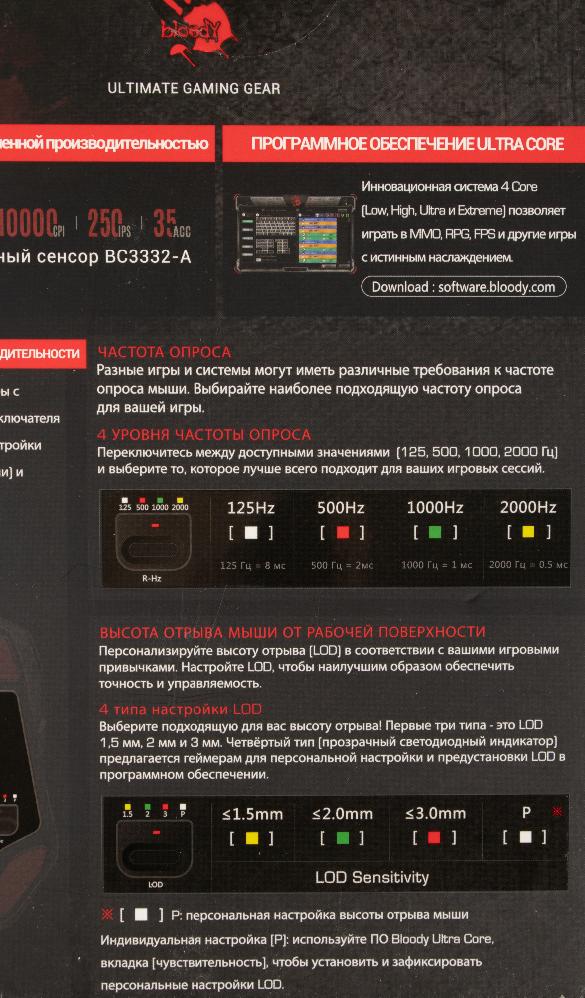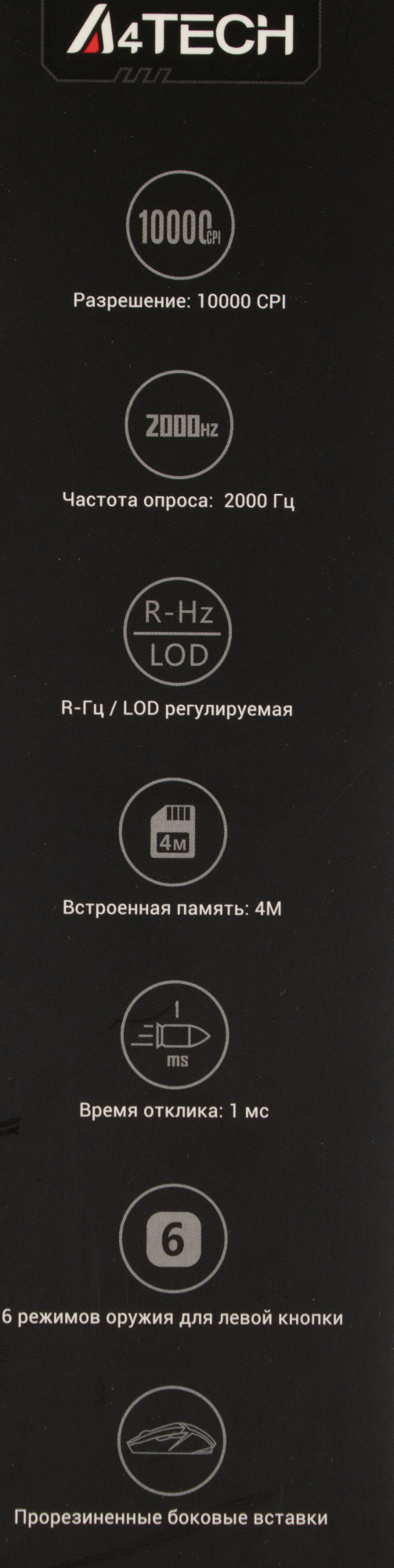 | Особенности | 5 эффектов подсветки Прорезиненный скролл Металлические ножки X' Glide 4 типа настройки высоты отрыва LOD. при установке ПО Bloody7, уровни core3,4 активированы бесплатно |