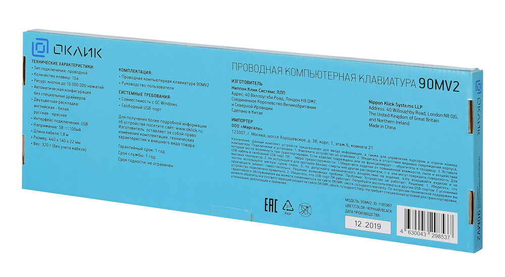 | Особенности | Мембранная офисная клавиатура с длинным кабелем 1,8 м. |
