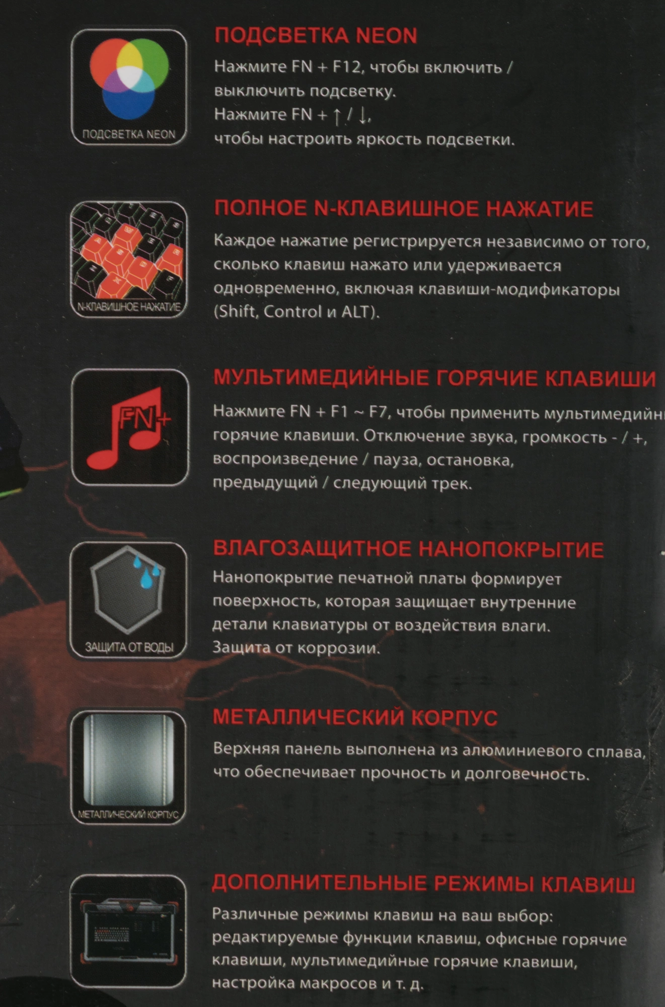 | Особенности клавиш | клавиша функции (Fn), клавиши управления мультимедиа, программируемые клавиши, управление подсветкой |