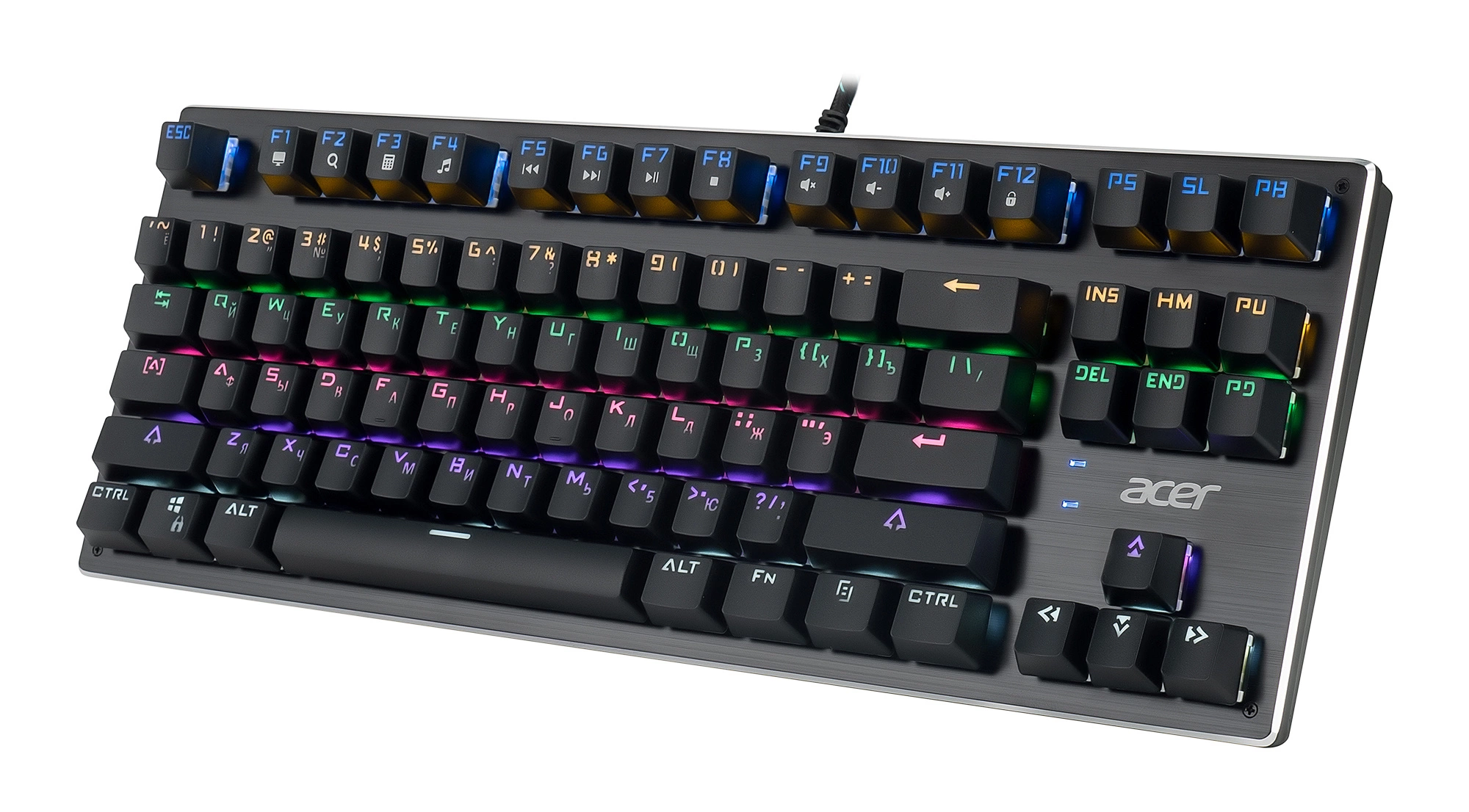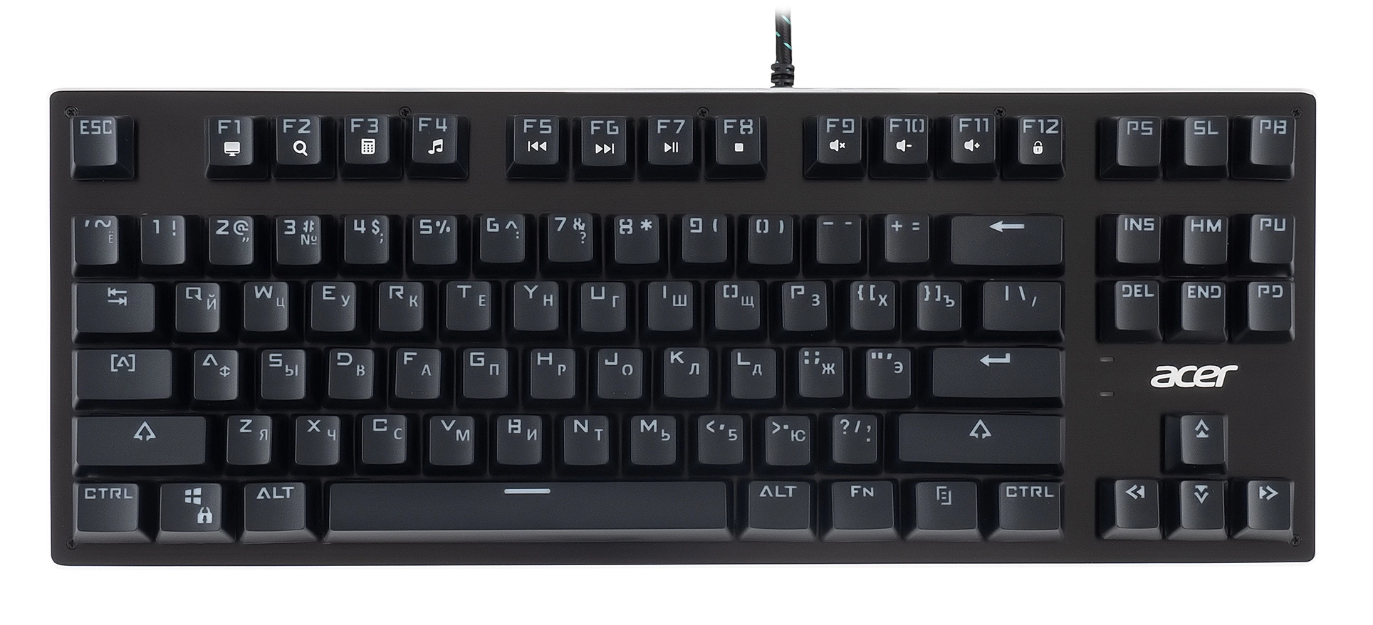 | Особенности | Компактная механическая клавиатура без цифрового блока. Занимает меньше места. Прорезиненные ножки, Жесткая металлическая пластина, длинный кабель, регулируемая подсветка. Поддержка мультимедийных функций. Универсальный инструмент для работы и игр.Функция регулировки яркости подсветки. |