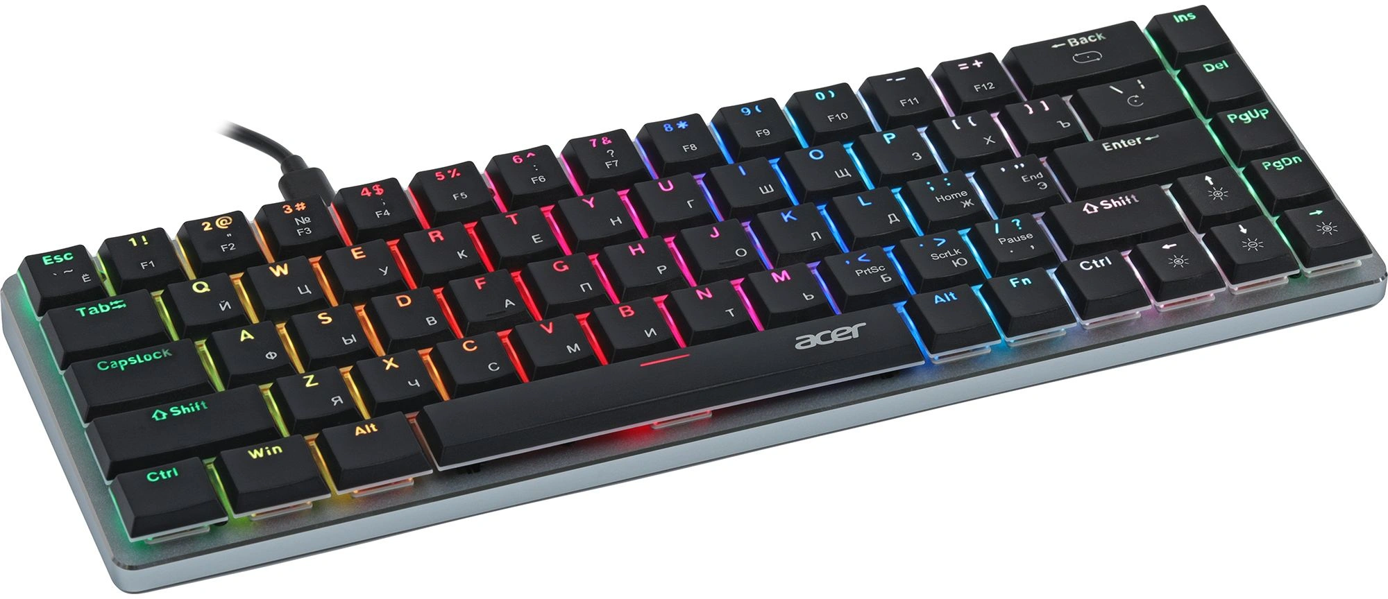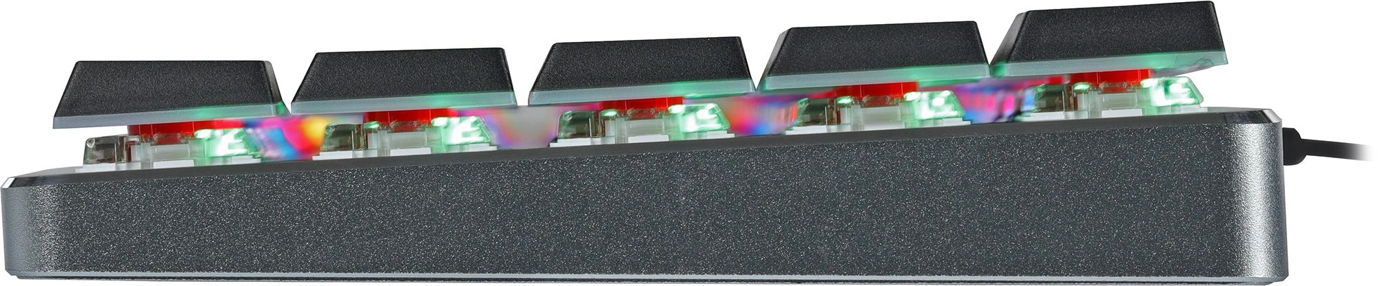 | Особенности | Механическая клавиатура с низкопрофильными свичами. Алюминиевый корпус с резиновыми противоскользящими ножками. Съемный кабель. Регулируемая RGB подсветка. Компактная. Идеальна как для работы так и для игр. |