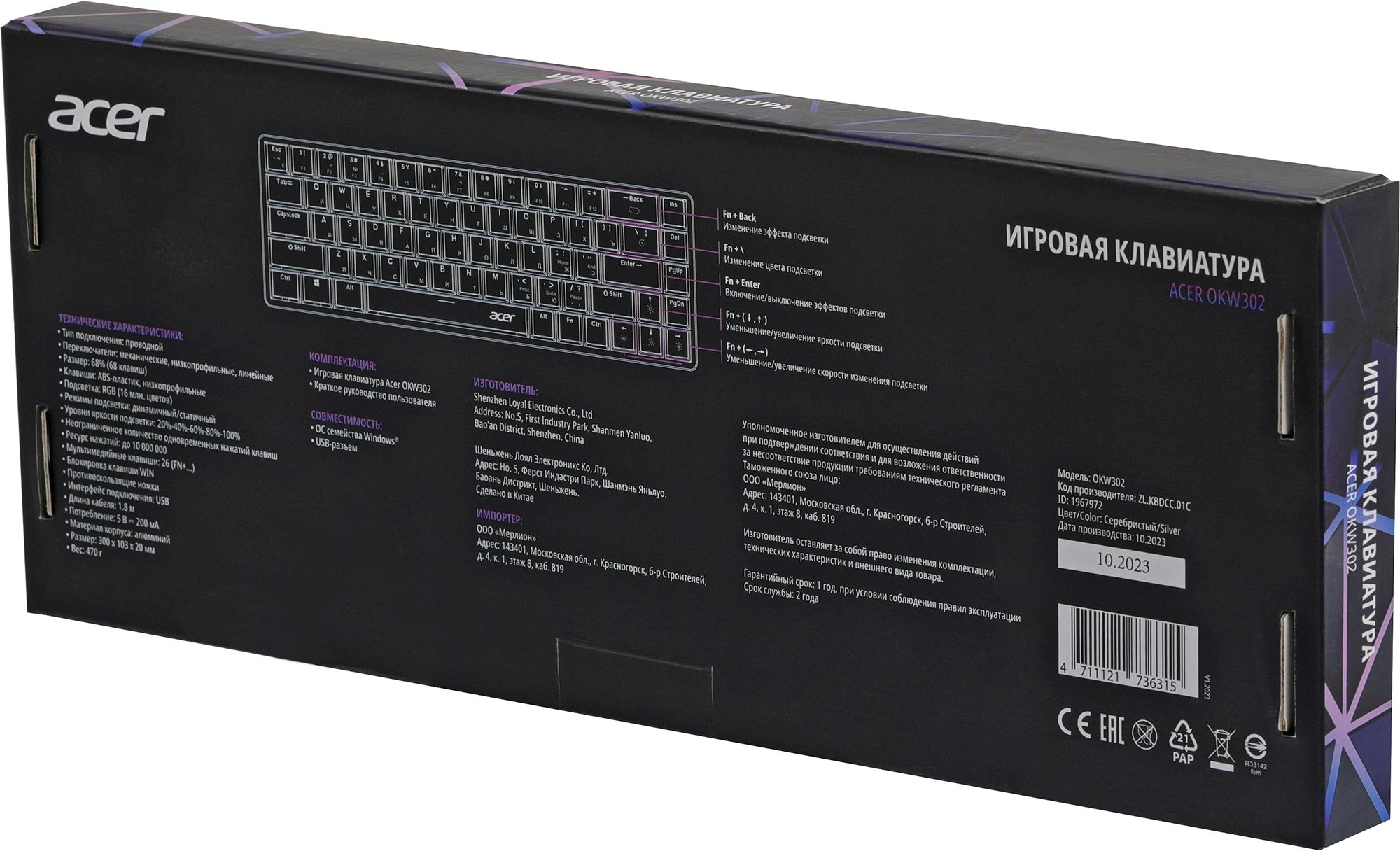 Клавиатура Acer OKW302 механическая серебристый USB for gamer LED (ZL.KBDCC.01C)