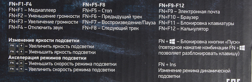 | Особенности | 6 цветов подсветки, 10 режимов, металлический корпус. ANTI-GHOSTING с неограниченным количеством одновременных, Ресурс клавиш до 50 000 000 нажатий, Мультимедийные клавиши (FN-F1-F12) |
