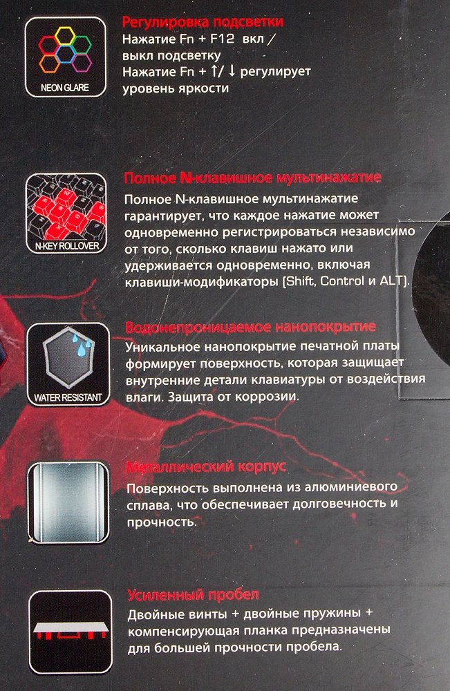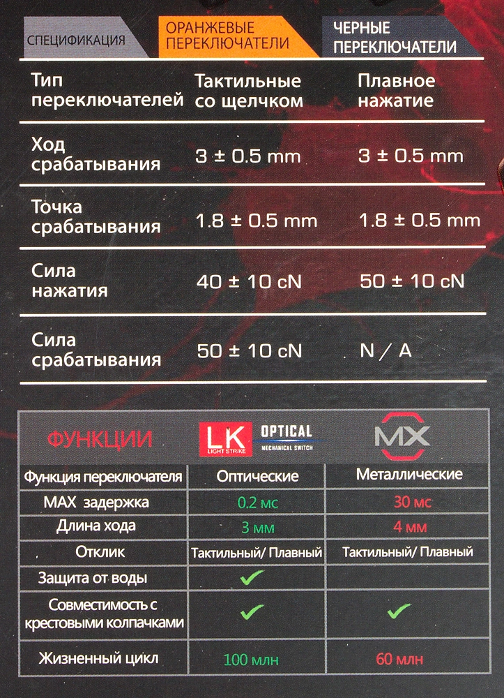 | Особенности | Технология: Light Strike. Время отклика: 0.2 мс. Полное N-клавишное мультинажатие. |