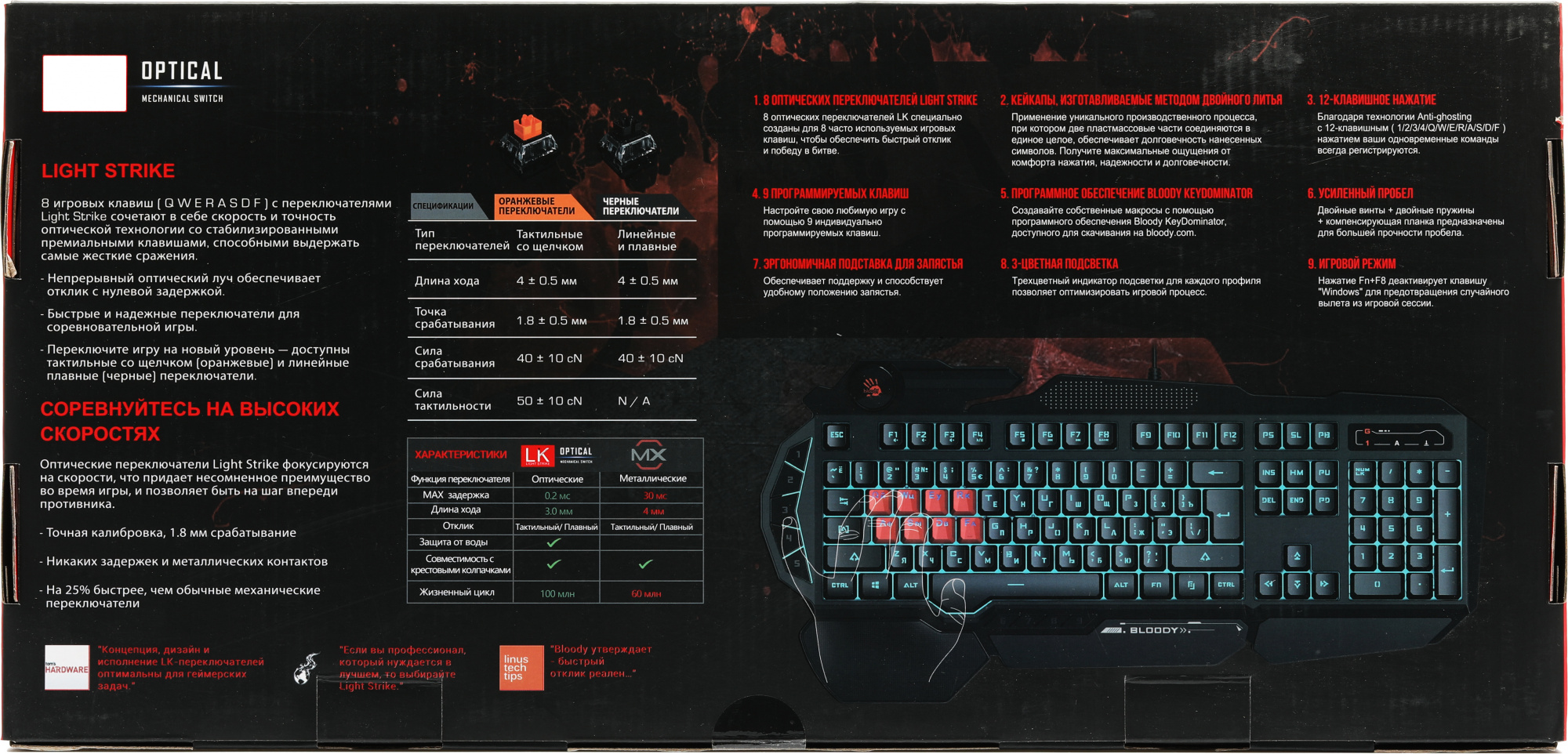 | Особенности | тип клавиш – мембранные (частично механика), 8 игровых клавиш, время отклика – 0.2 мс., усиленный пробел, прорезиненные ножки. Технология: Light Strike. Оптические переключатели: QWER/ASDF. |
