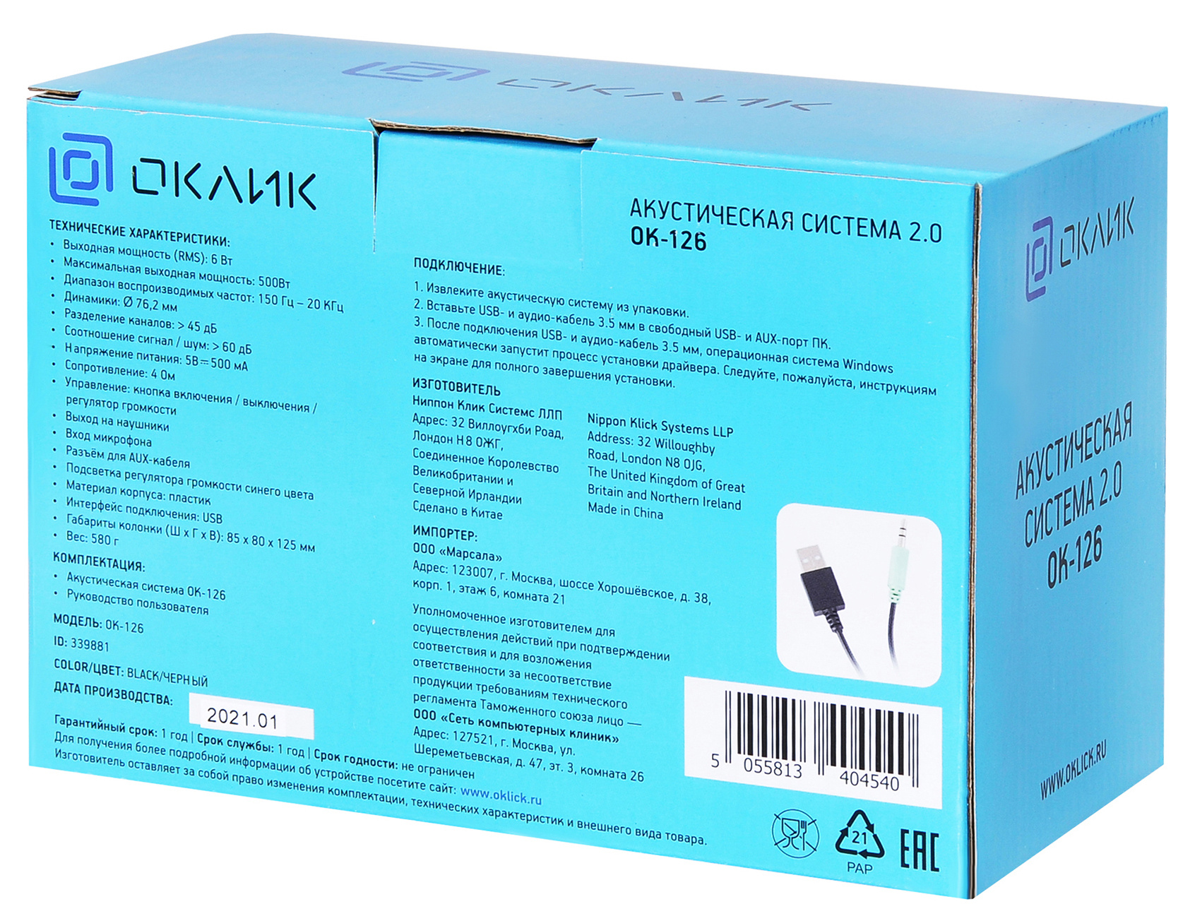 Колонки Оклик OK-126 2.0 черный 6Вт