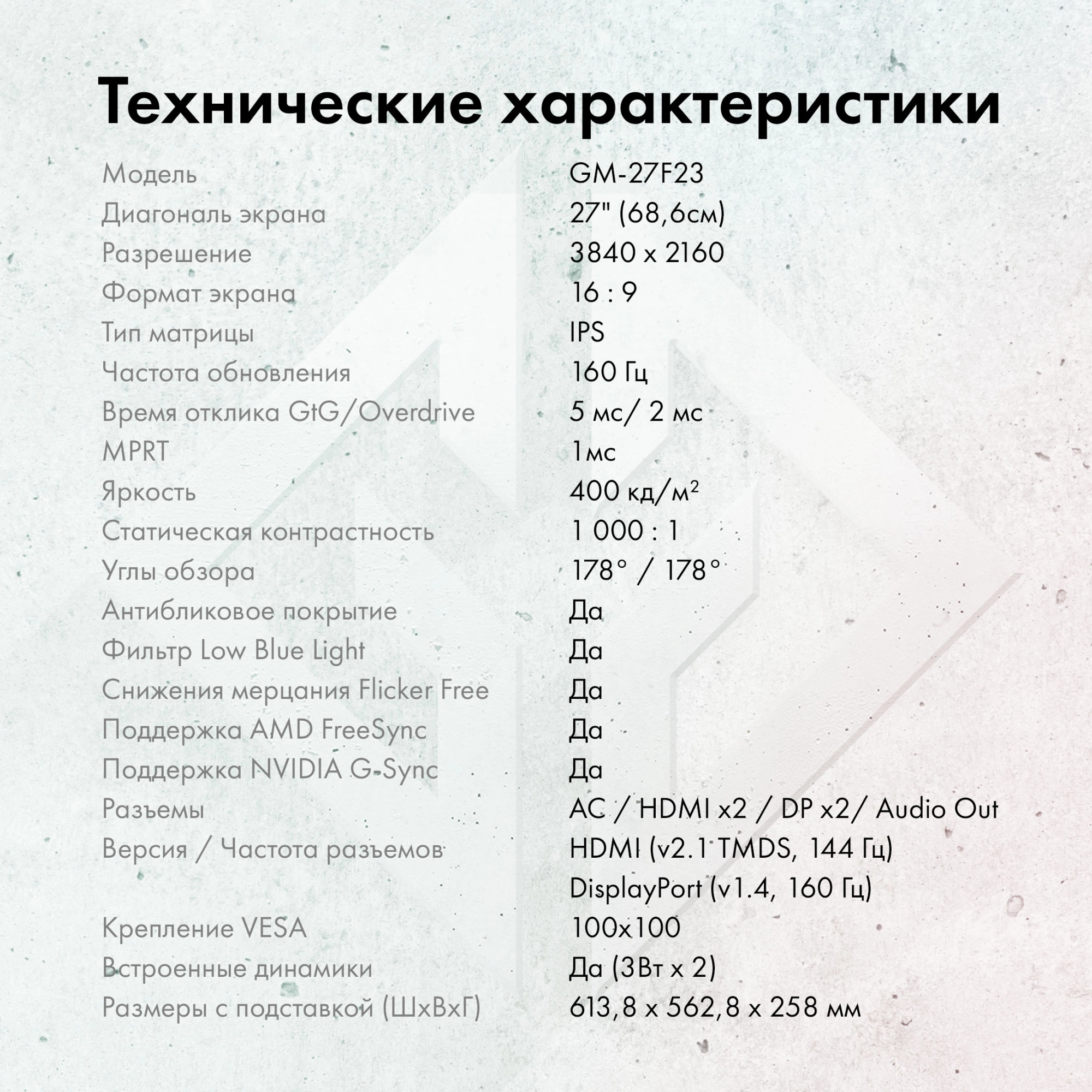 Монитор GMNG 27" Gaming GM-27F23 черный IPS LED 2ms 16:9 HDMI M/M матовая HAS Piv 400cd 178гр/178гр 3840x2160 160Hz G-Sync FreeSync DP Quad 4K (2160p) 6.63кг