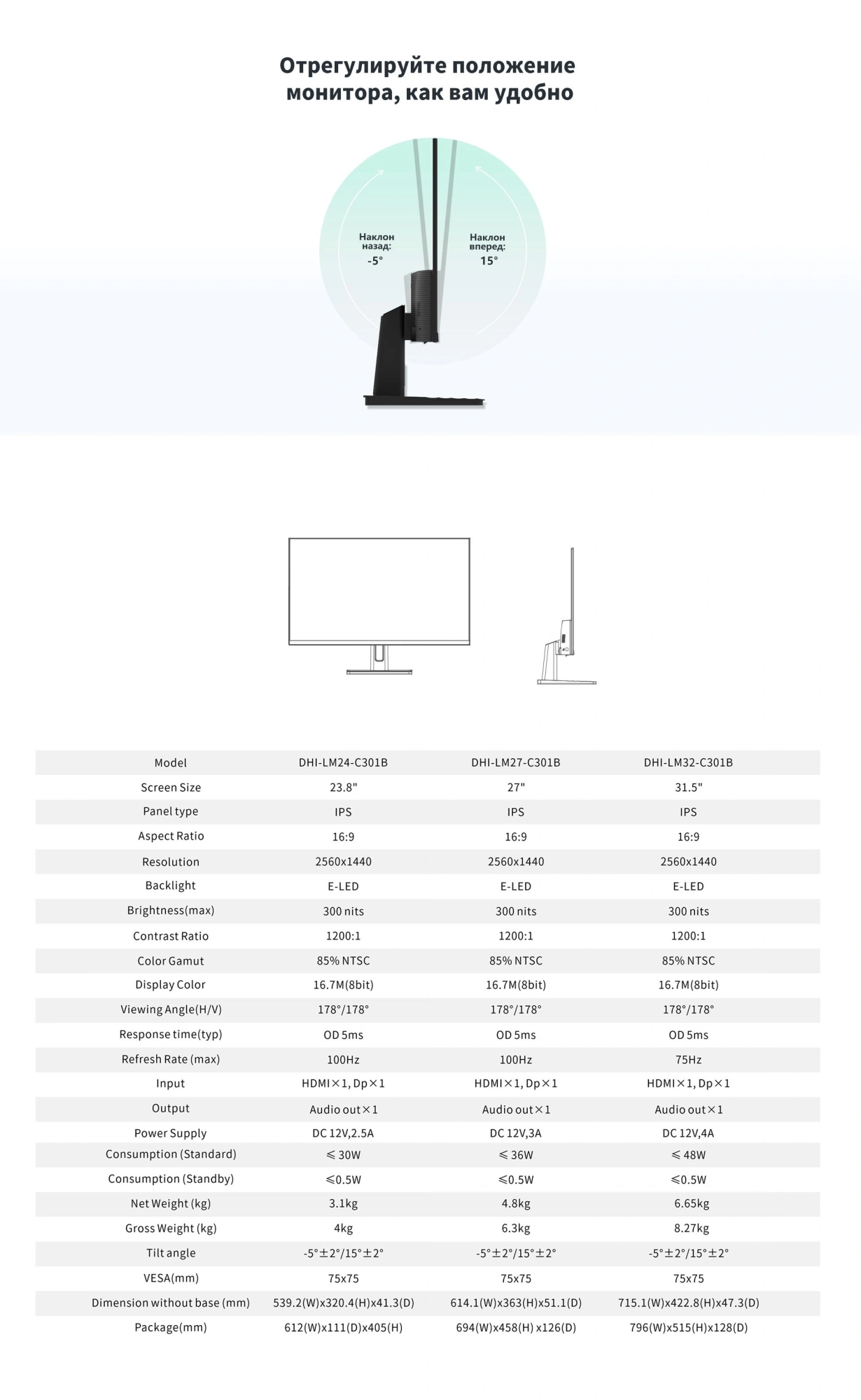 Монитор Dahua 27" DHI-LM27-C301B черный IPS LED 5ms 16:9 HDMI матовая 1200:1 300cd 178гр/178гр 2560x1440 100Hz DP 2K 4.8кг