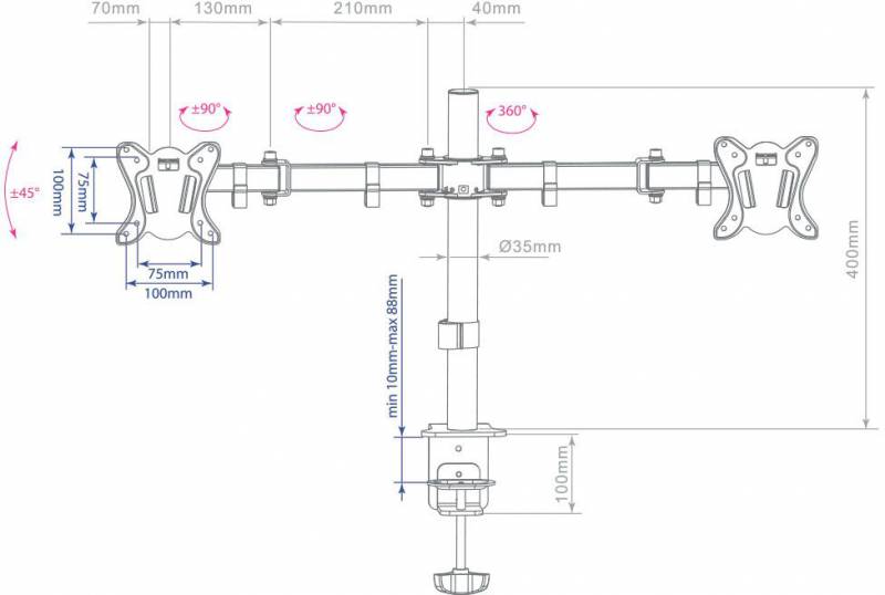 | Особенности | Максимальная нагрузка: 2x8 кг. Регулируемое по высоте крепление. Мощная стальная конструкция. Съемная монтажная пластина. Надёжное крепление к столу |