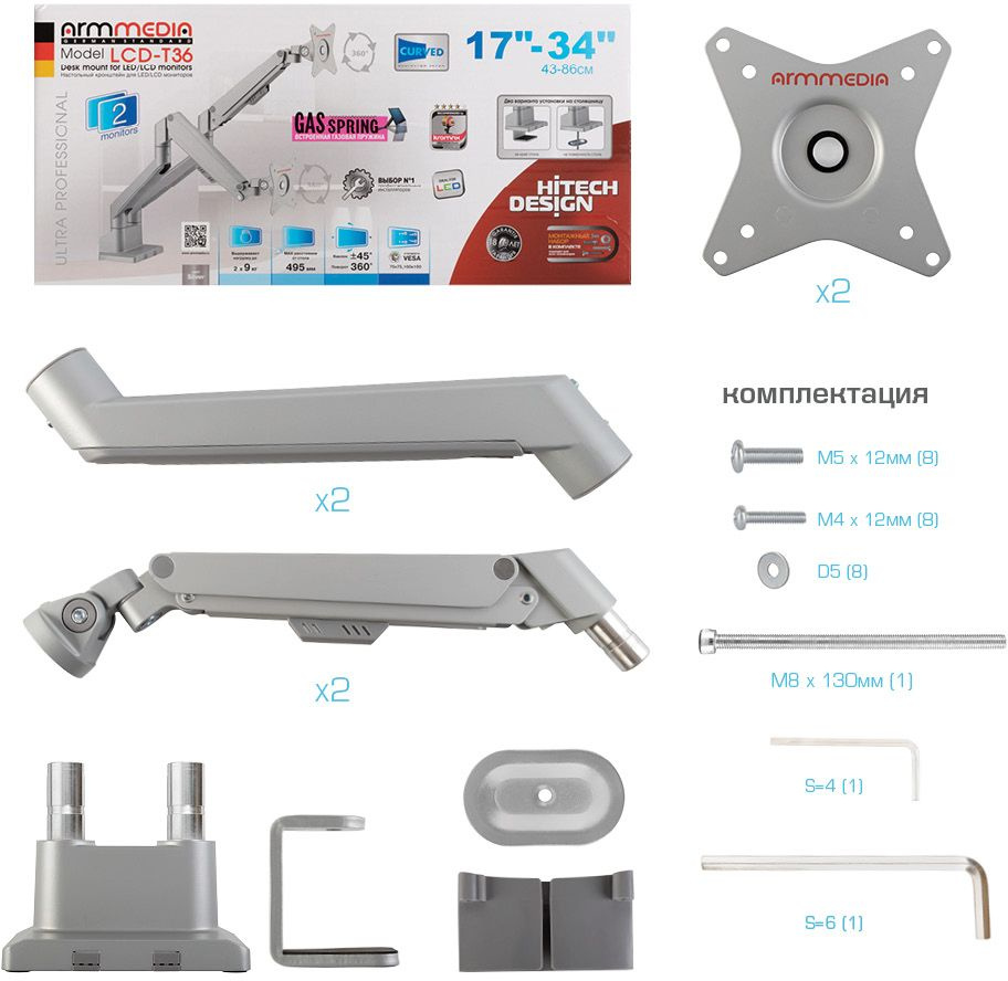 Кронштейн для мониторов Arm Media LCD-T36 серебристый 15"-34" макс.9кг настольный поворот и наклон верт.перемещ.