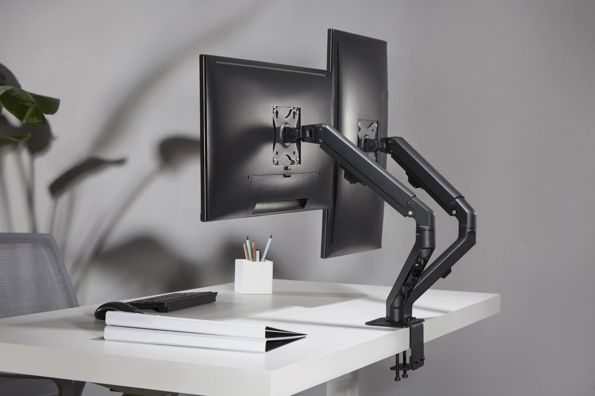 | Особенности | Настольный кронштейн с двумя креплениями под мониторы. Пружинный механизм позволяет легко перемещаться вверх и вниз. |