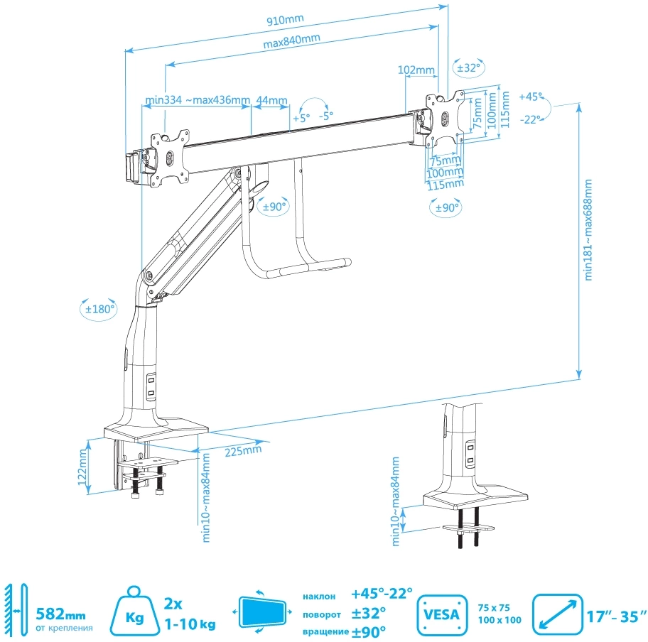 | Подходит для мониторов c диагональю | 19", 22", 26", 32" |