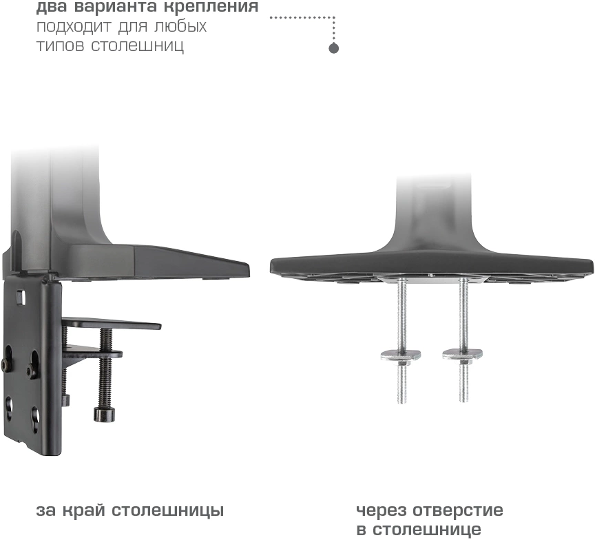 | Особенности | Надежная стальная конструкция, Многофункциональный – мониторы на кронштейне можно поворачивать вокруг совей оси на 360°, наклонять вверх и вниз, придвигать или удалять от себя, Регулируемое положение по высоте, максимальная высота 688 мм, Кабель-каналы для укладки соединительных кабелей |