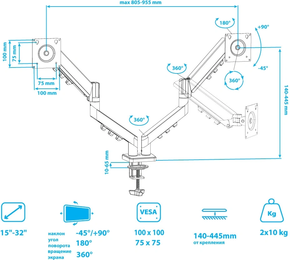 | Комплектация | Настольный кронштейн для монитора, комплект ключей и крепежа для установки, подробная инструкция на русском языке |