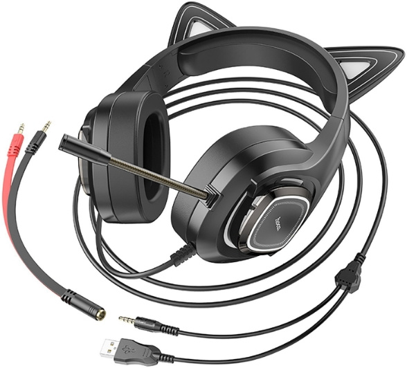 | Особенности | Наушники проводные, игровая гарнитура Hoco W107, светящиеся игровые наушники с кошачьими ушками. Оснащенный кабелем аудио-адаптера «один-два». Интерфейс: USB + 3,5 разъем |