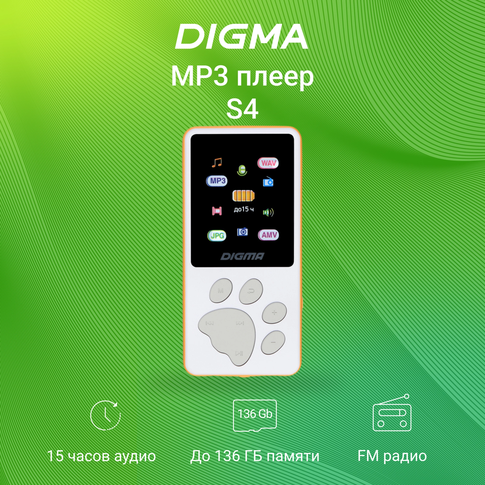 Плеер Hi-Fi Flash Digma S4 8Gb белый/оранжевый/1.8"/FM/microSDHC