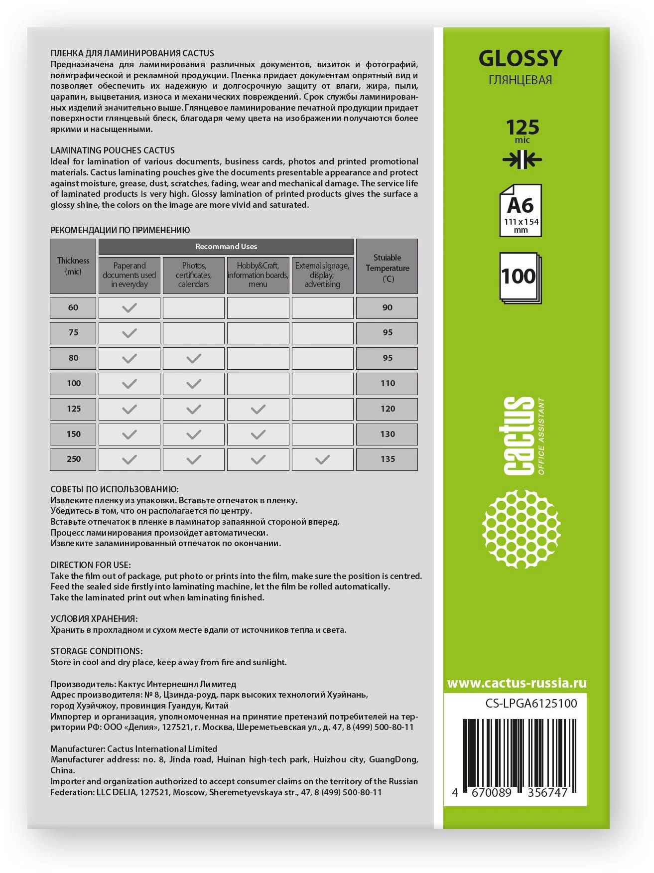 Пленка для ламинирования Cactus 125мкм A6 (100шт) глянцевая 111x154мм CS-LPGА6125100