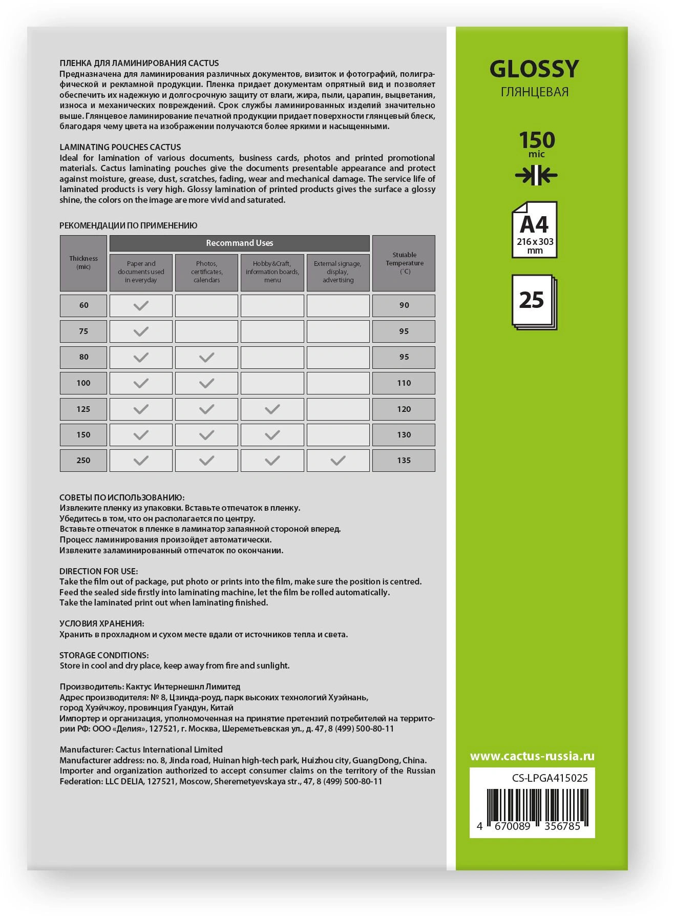 Пленка для ламинирования Cactus 150мкм A4 (25шт) глянцевая 216x303мм CS-LPGА415025