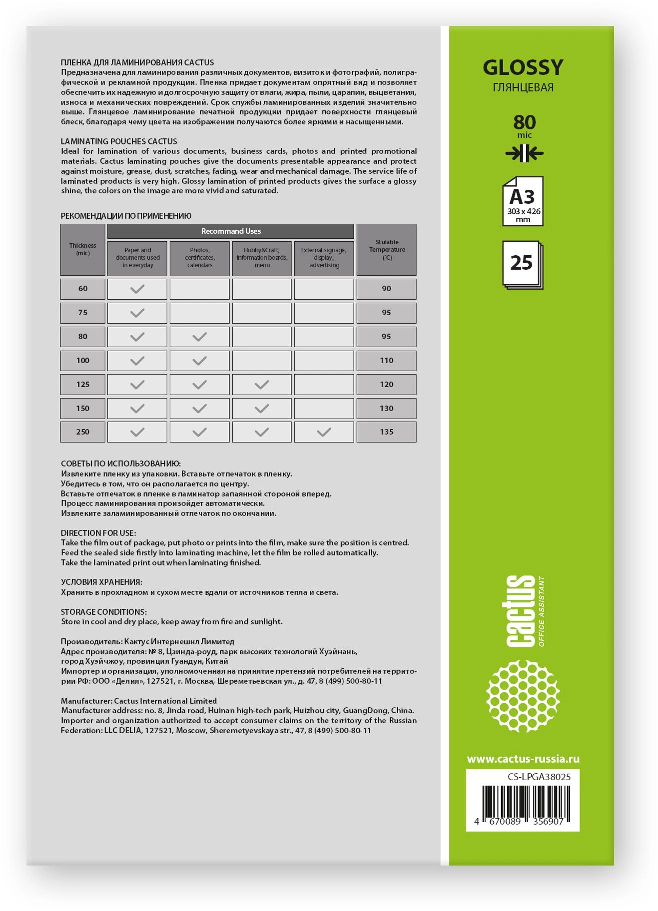 Пленка для ламинирования Cactus 80мкм A3 (25шт) глянцевая 303x426мм CS-LPGА38025