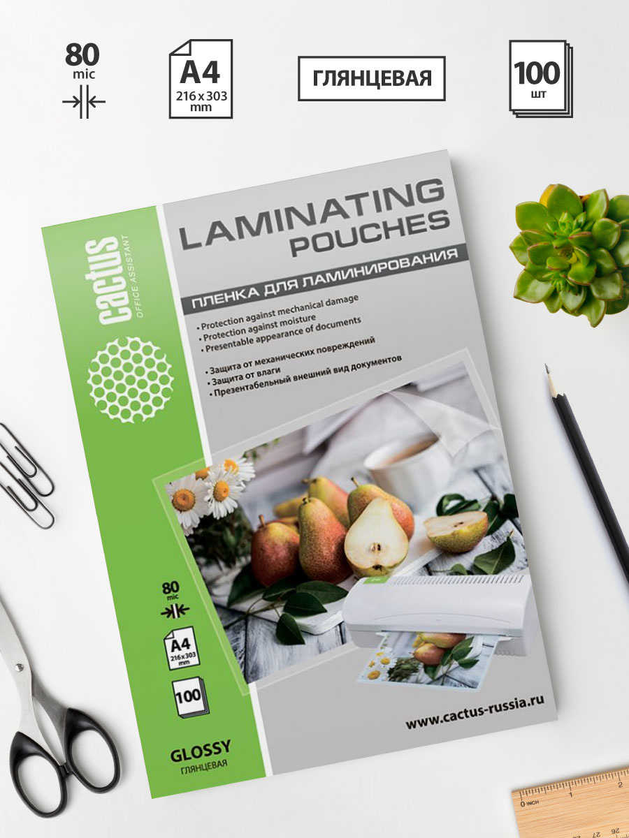 Пленка для ламинирования Cactus 80мкм A4 (100шт) глянцевая 216x303мм CS-LPGA480100