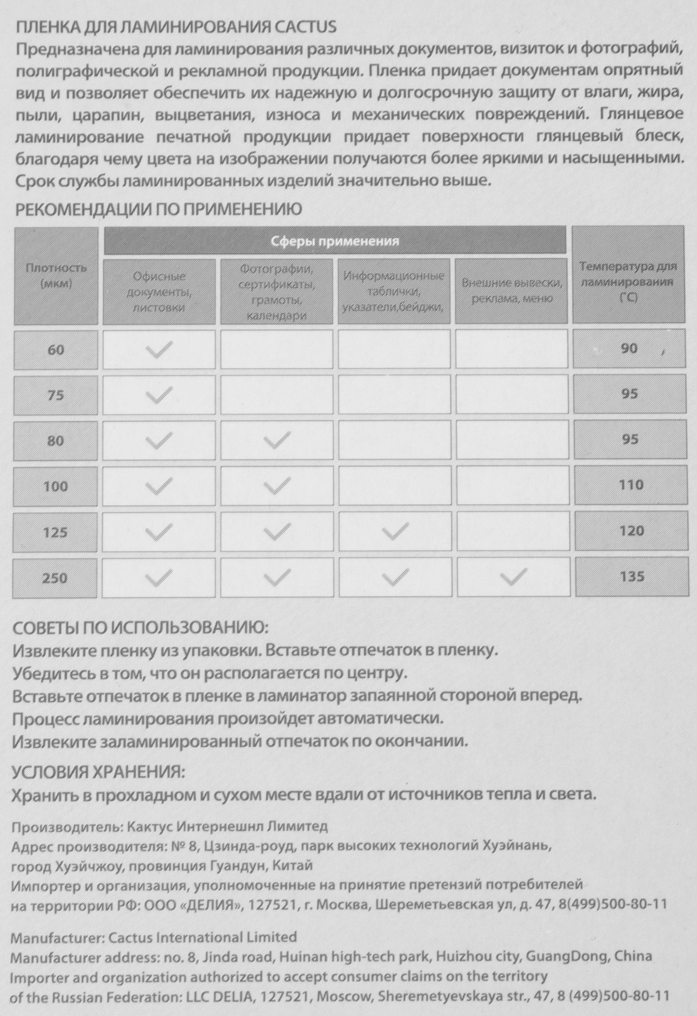 Пленка для ламинирования Cactus 100мкм (100шт) глянцевая 65x95мм CS-LPG6595100