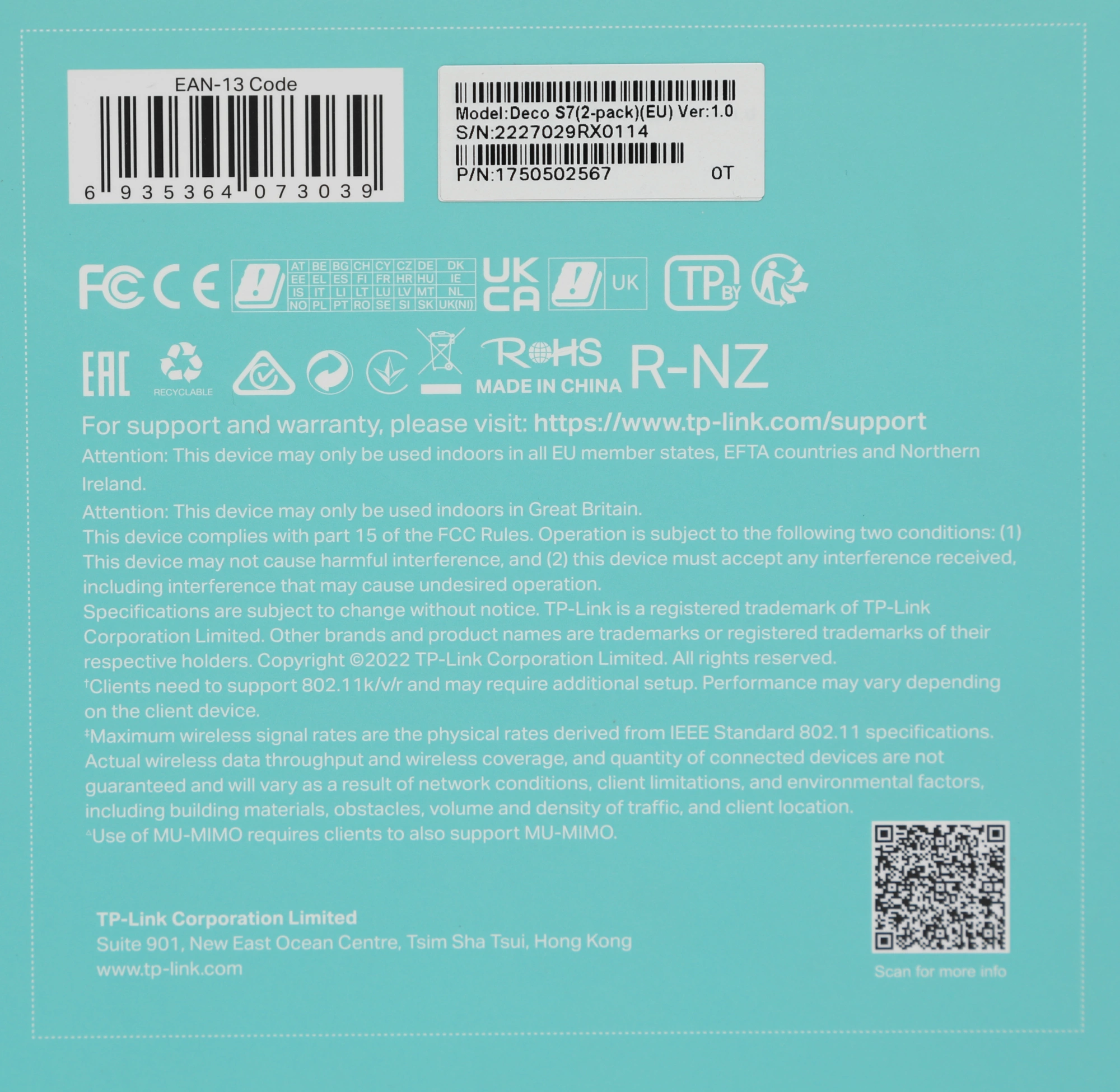| Комплектация | Deco S7 (2 шт.), кабель Ethernet RJ45, адаптер питания (2 шт.), краткое руководство по настройке. |
