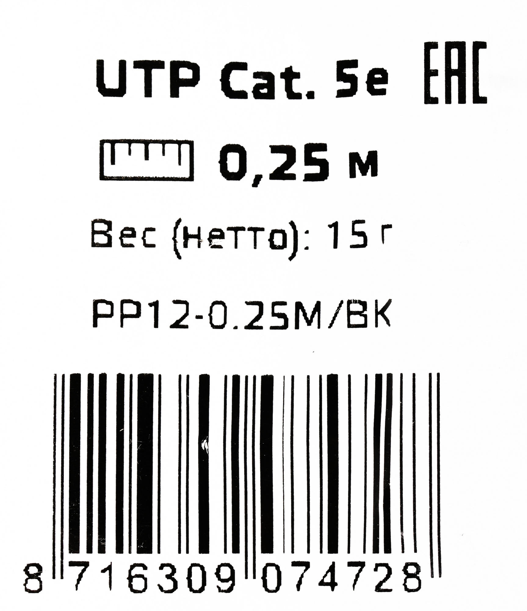 Патч-корд PP12-0.25M/BK 1000G UTP 4 пары cat5E CCA molded 0.25м черный RJ-45 (m)-RJ-45 (m)