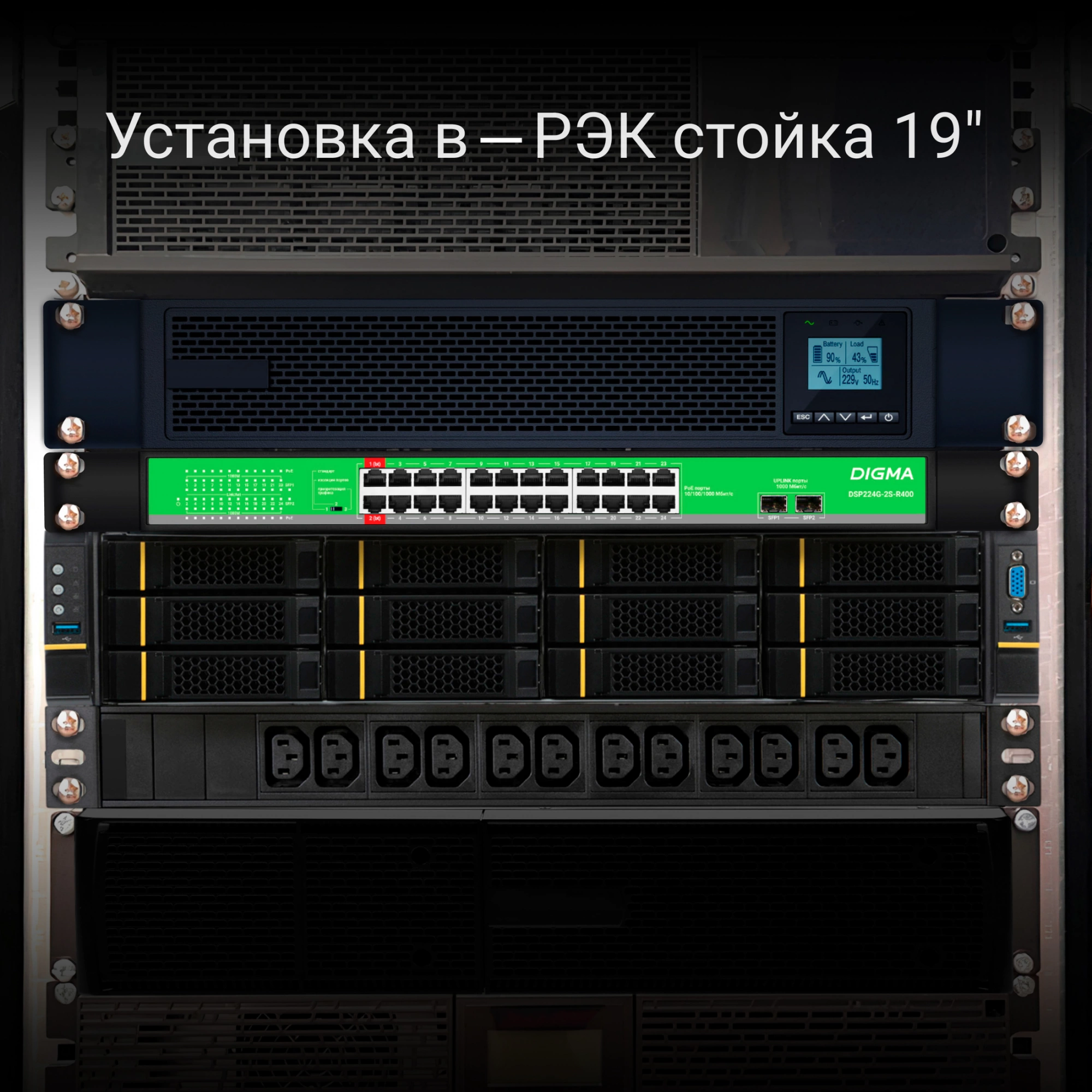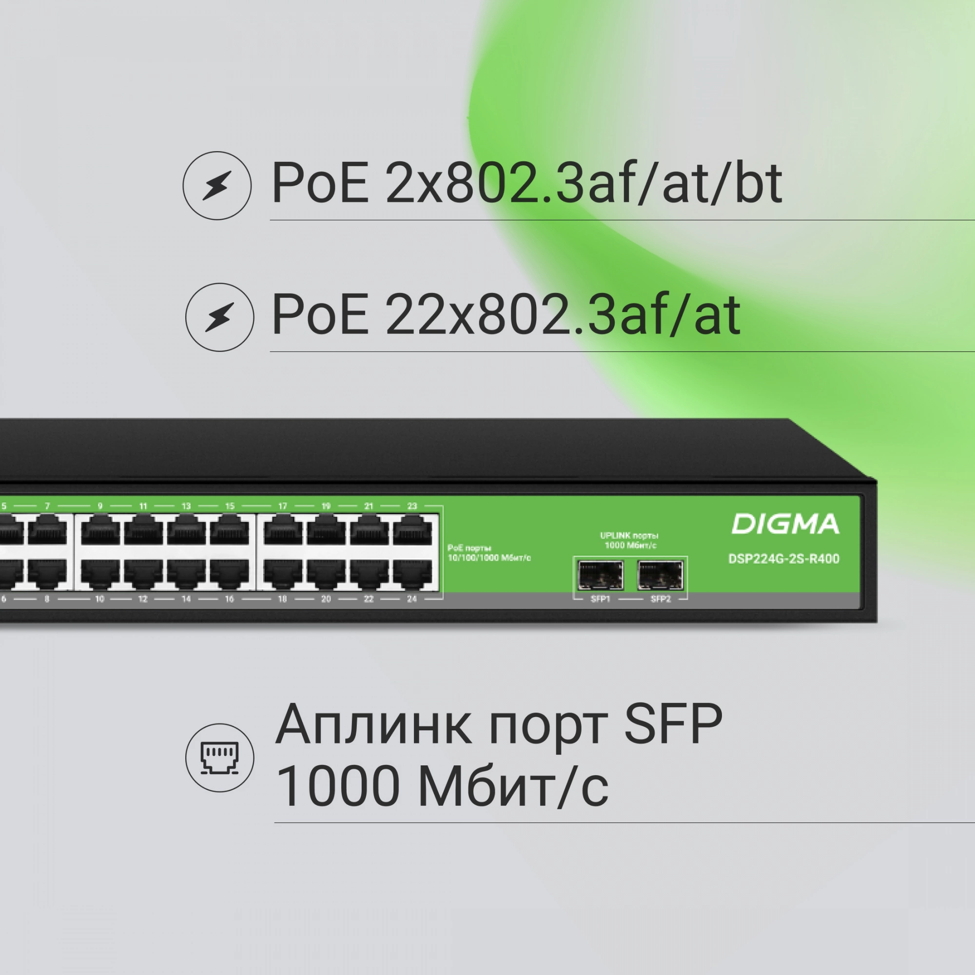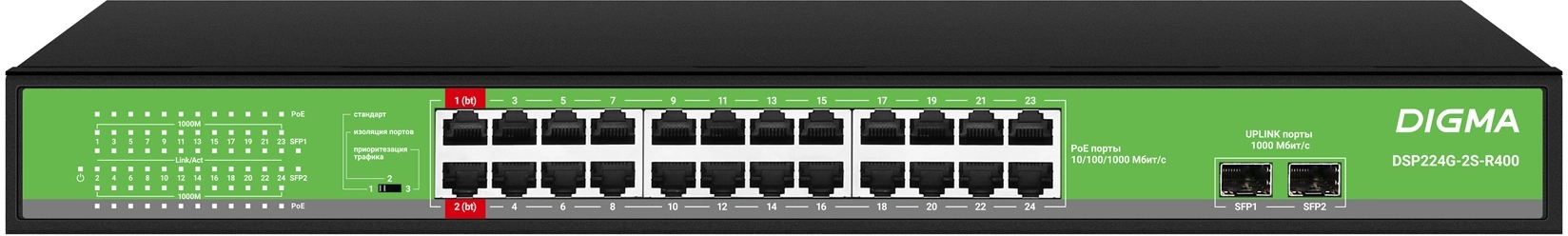 Коммутатор Digma DSP224G-2S-R400 (L2) 24x1Гбит/с 2SFP 24PoE 24PoE+ 2PoE++ 400W неуправляемый