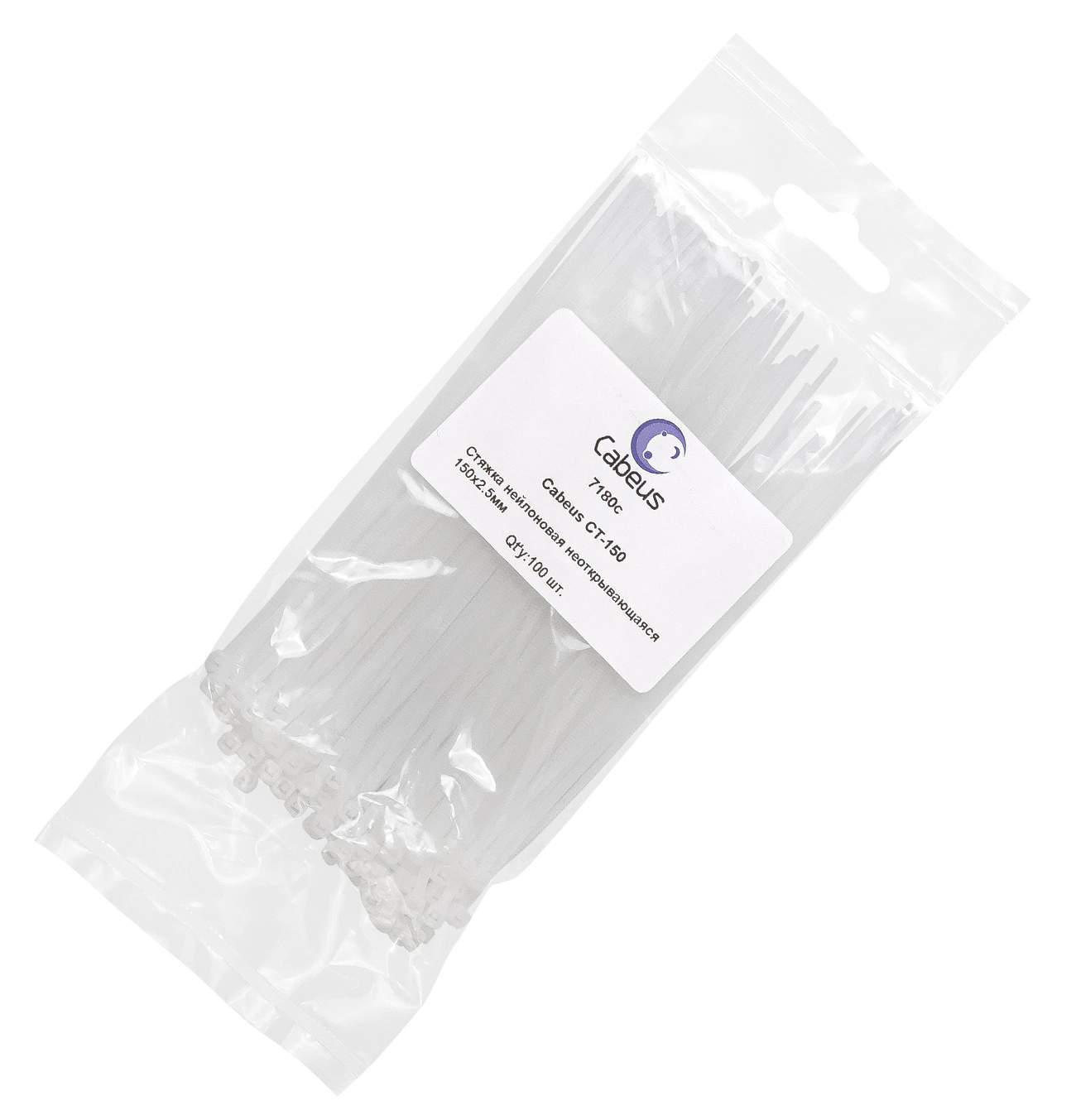 Стяжка пластиковая Cabeus CT-150 150x2.5мм (упак:100шт) нейлон внешний (-40/+85) белый