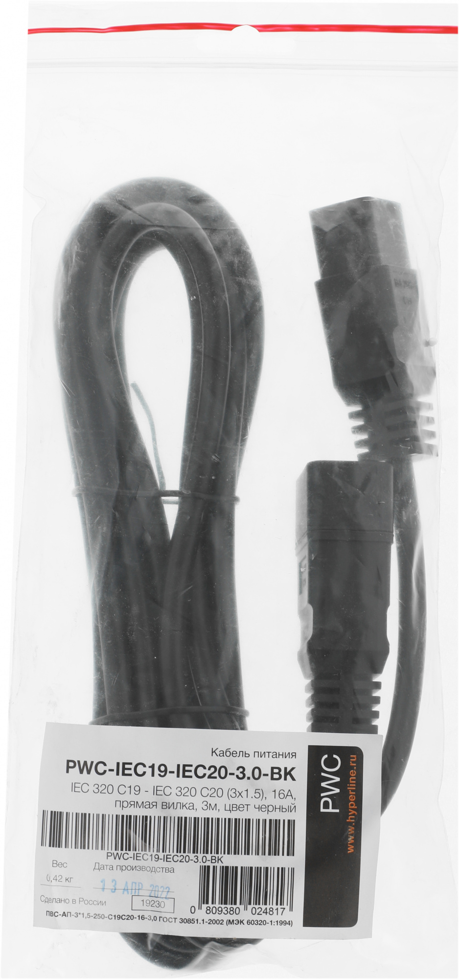 Шнур питания Hyperline PWC-IEC19-IEC20-3.0-BK C19-C20 проводник.:3x1.5мм2 3м 250В 16А (упак.:1шт) черный