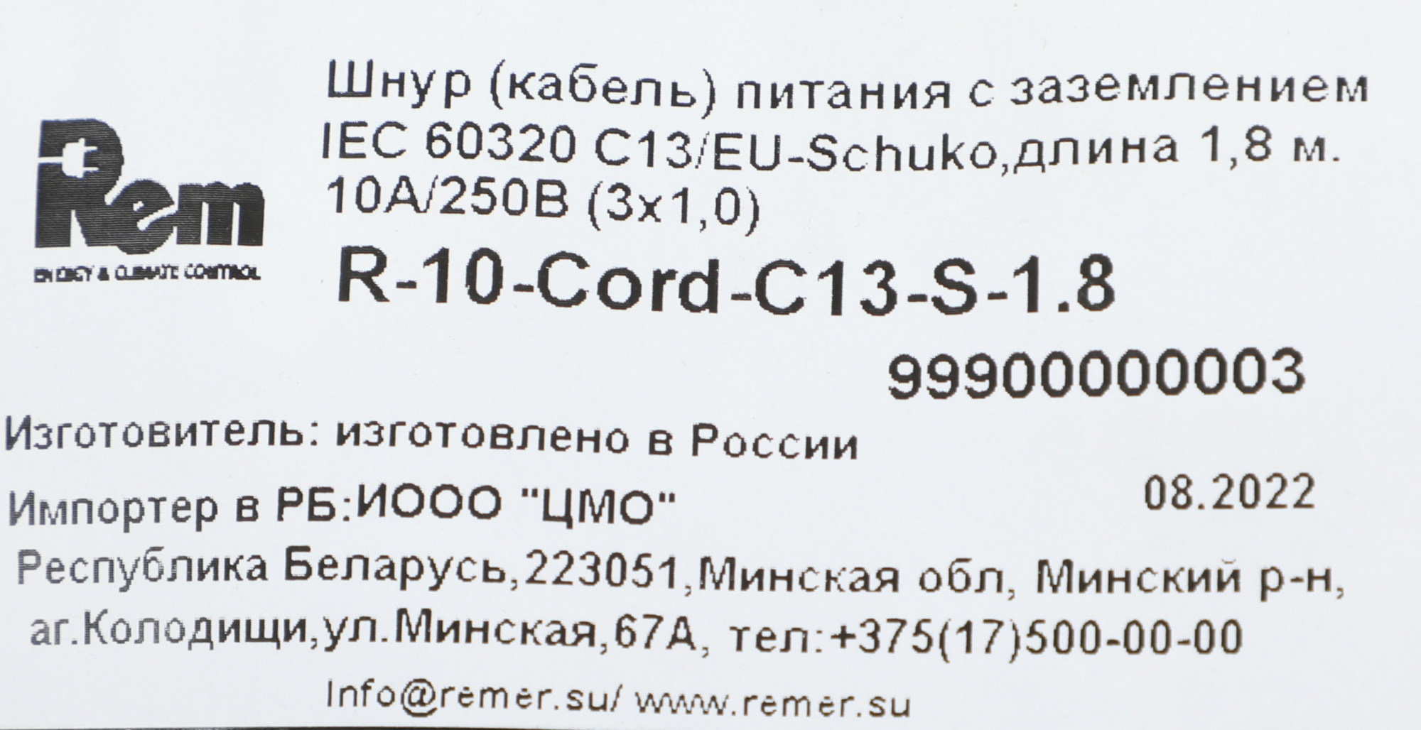 | PartNumber/Артикул Производителя | R-10-Cord-C13-S-1.8 |