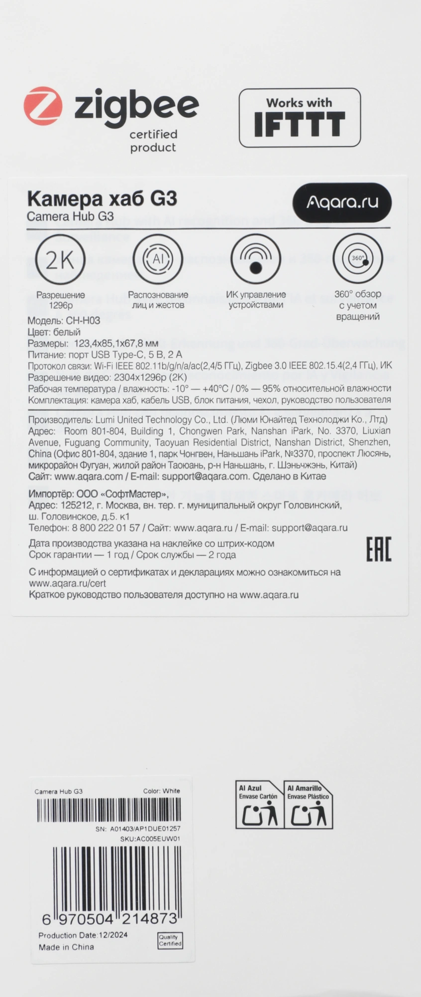 Камера видеонаблюдения IP Aqara Hub G3 3.6-3.6мм цв. корп.:белый (CH-H03)