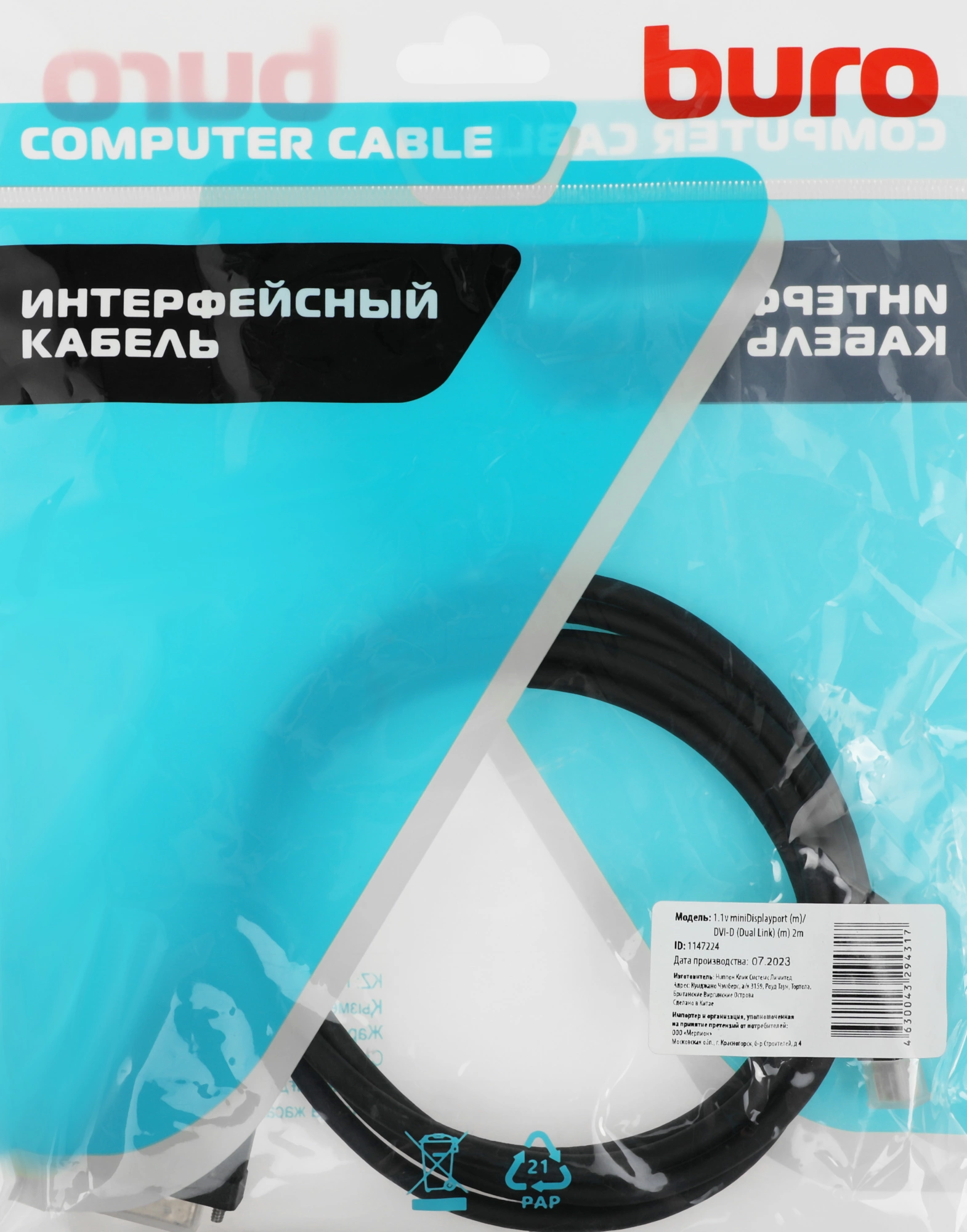 Кабель аудио-видео Buro 1.1v miniDisplayport (m)/DVI-D (Dual Link) (m) 2м. Позолоченные контакты черный (BHP MDPP-DVI-2)