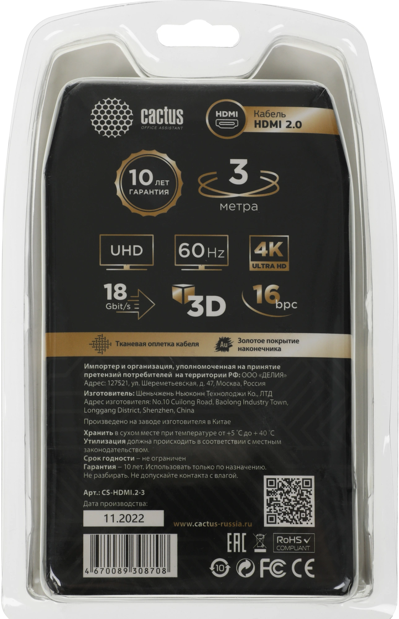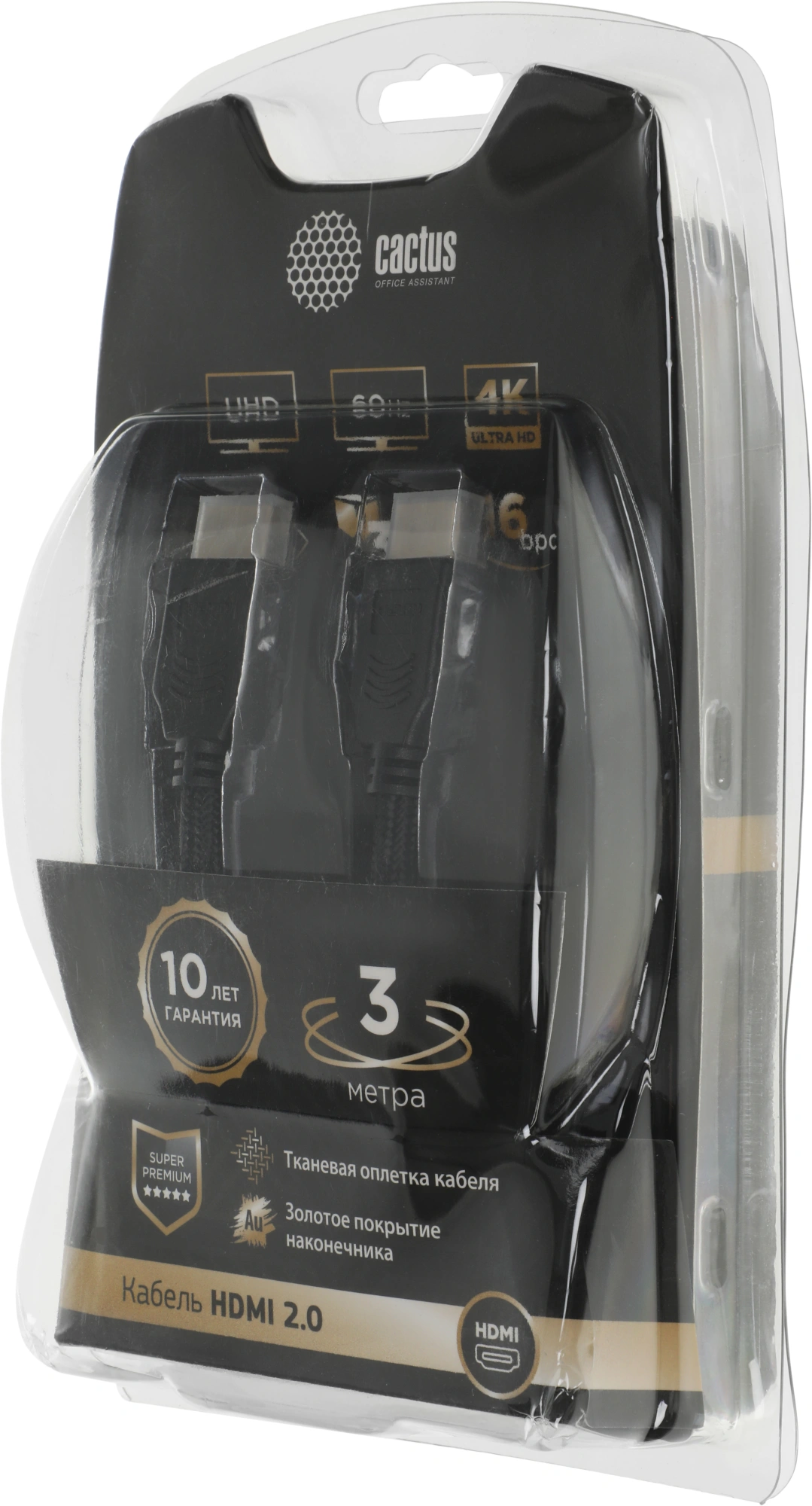 Кабель аудио-видео Cactus CS-HDMI.2-3 HDMI (m)/HDMI (m) 3м. Позолоченные контакты черный