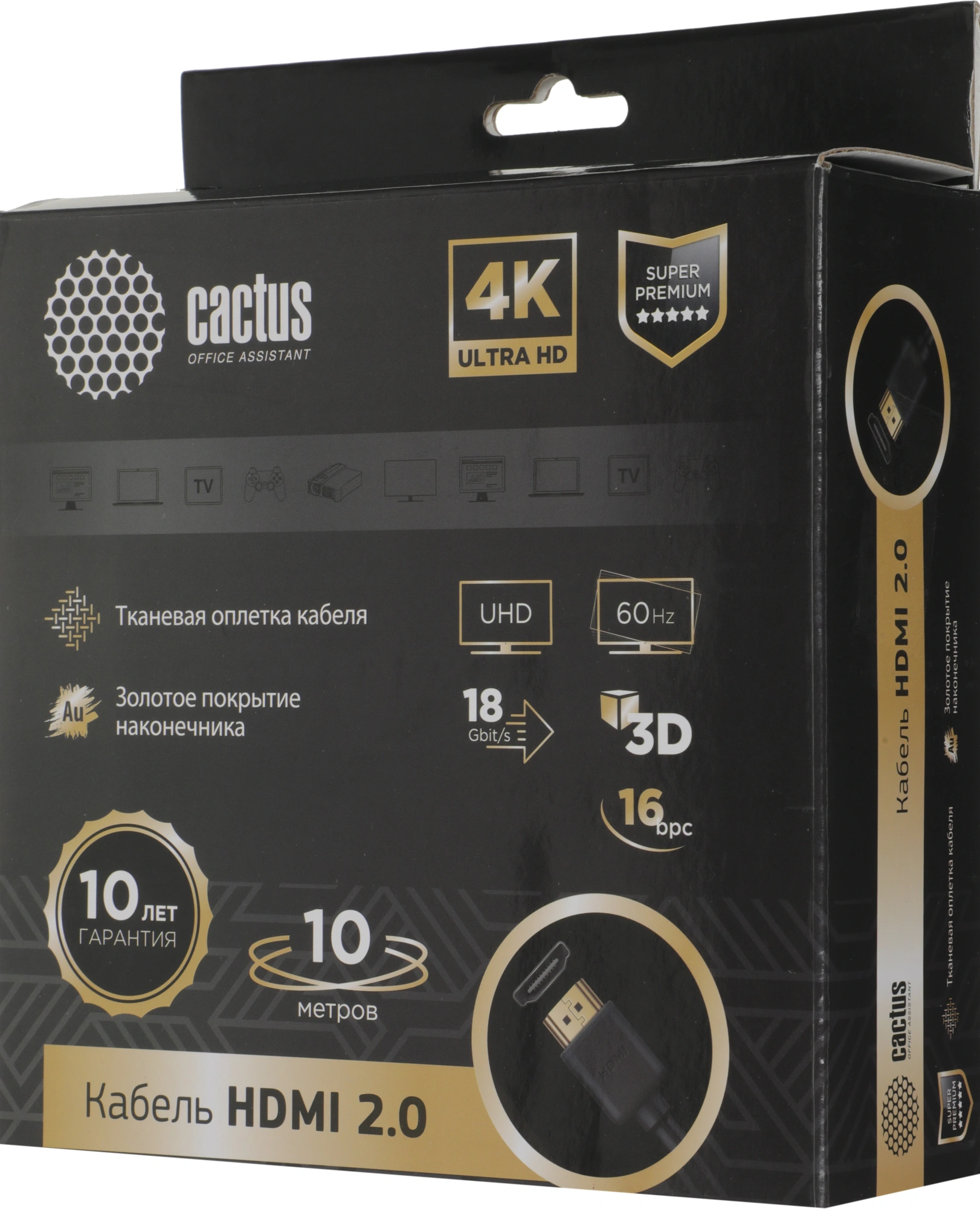 Кабель аудио-видео Cactus CS-HDMI.2-10 HDMI (m)/HDMI (m) 10м. Позолоченные контакты черный