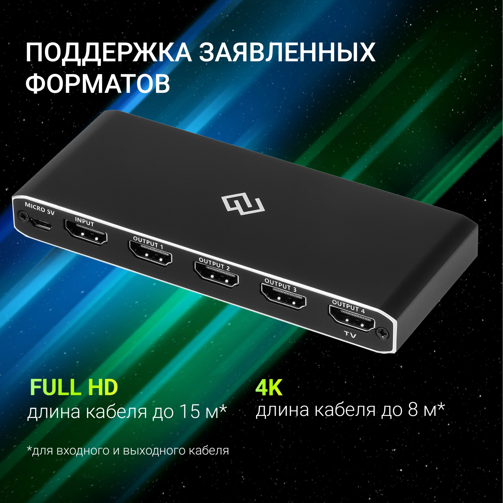 | Описание | Делитель HDMI сигнала с усилителем 1 х HDMI "ВХОД" - 4 x HDMI "ВЫХОД" VER. 2.0 |