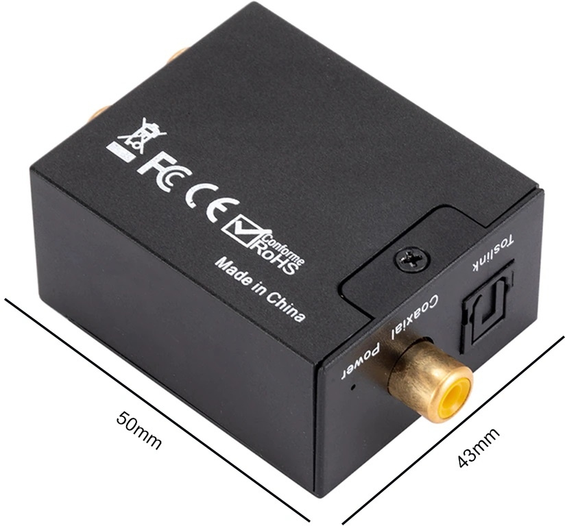 | Описание | Аудиоконвертер ЦАП (Цифро-аналоговый преобразователь) вход Коаксиальный (RCA) + Оптический (Toslink) - выход Аудио (RCA R + L) |